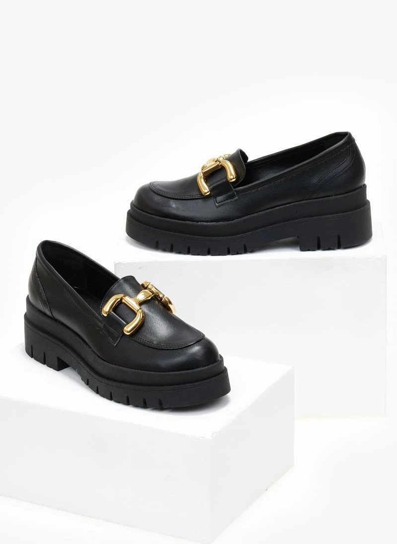 Loafers estil με χρυσό διακοσμητικό. Έχουν ψηλή τρακτερωτή σόλα. Ελληνικής κατασκευής.