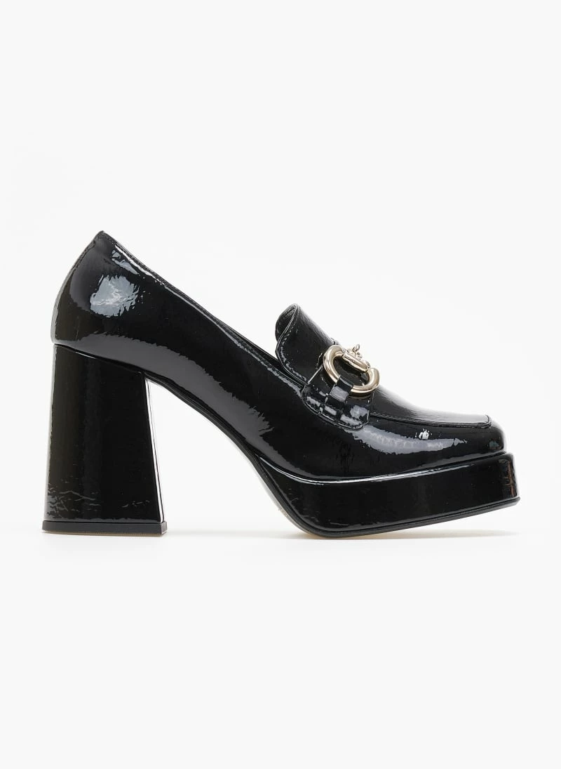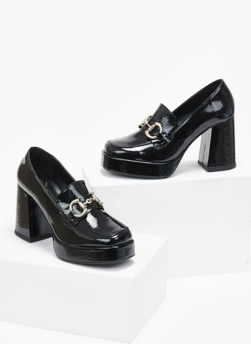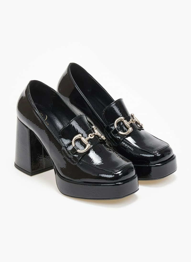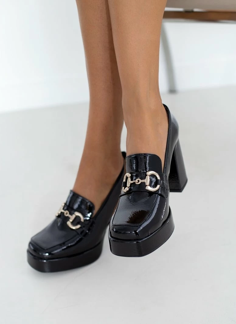 Loafers tfp λουστρίνι με χοντρό τακούνι .Έχουν καρε γραμμή. Μεταλλικό διακοσμητικό στο κουτεπιέ. Δερμάτινος πάτος. Ελληνικής κατασκευής.