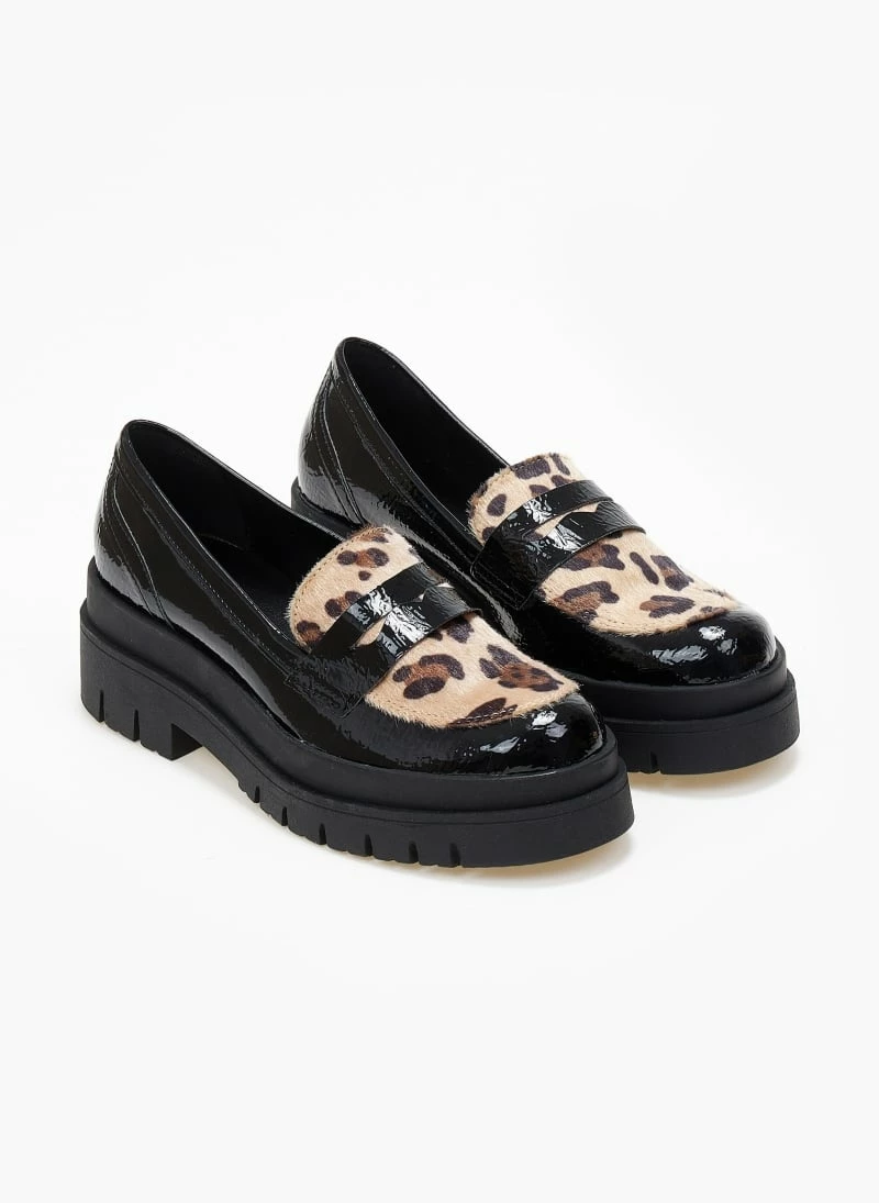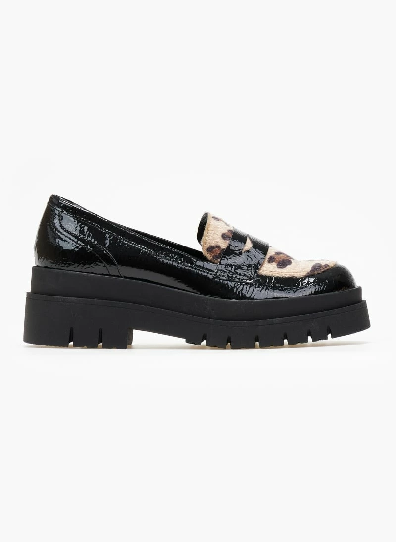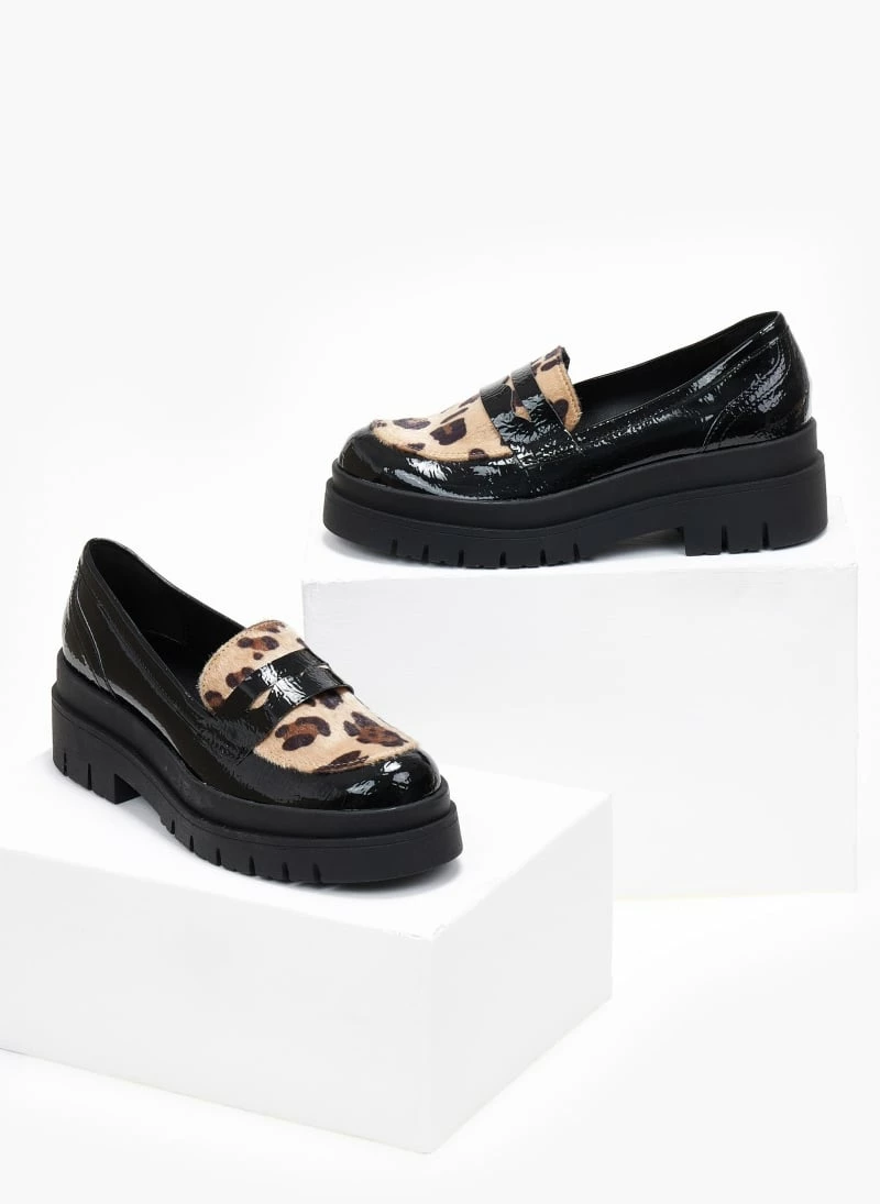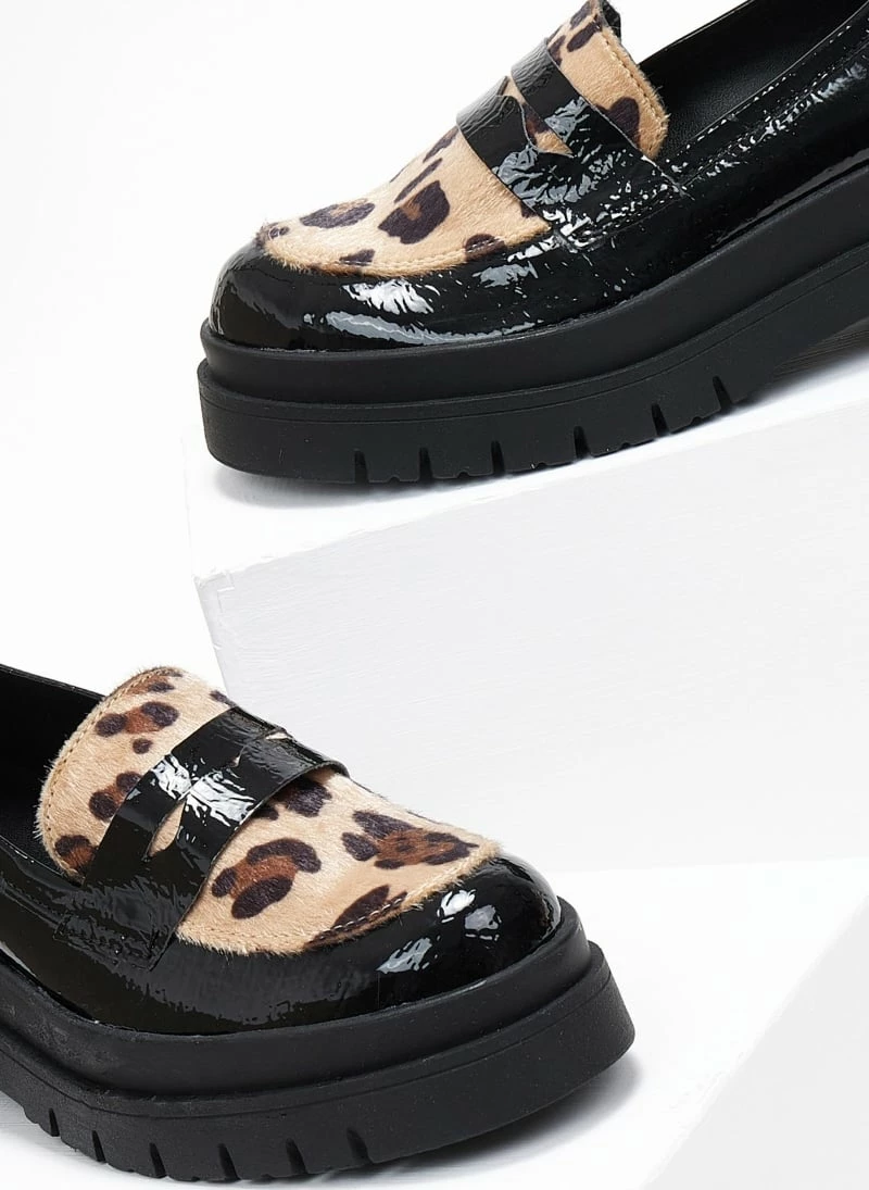 Loafers λουστρίνι estil με ψηλή σόλα. Έχουν animal print λεπτομέρεια από συνθετικό ponyskin. Ελληνικής κατασκευής.