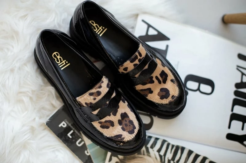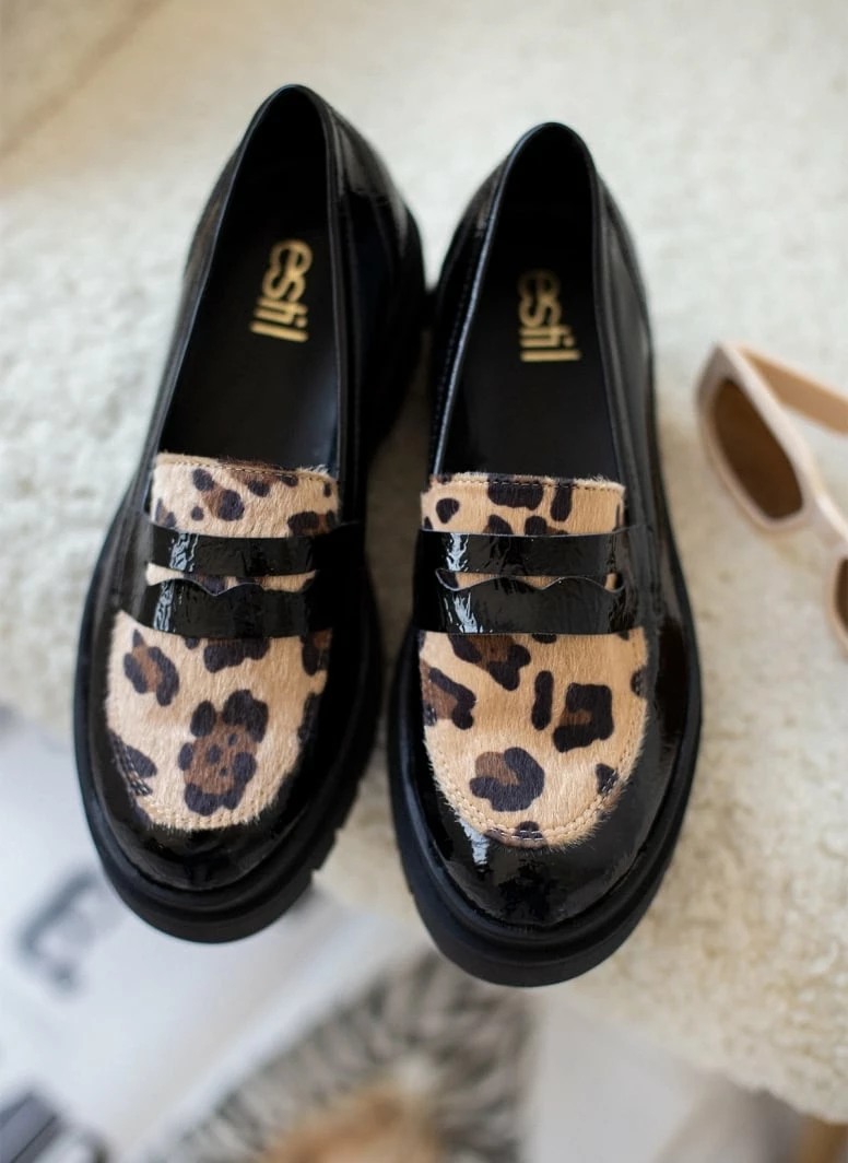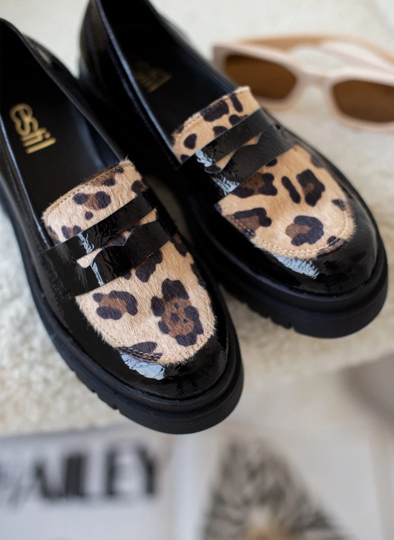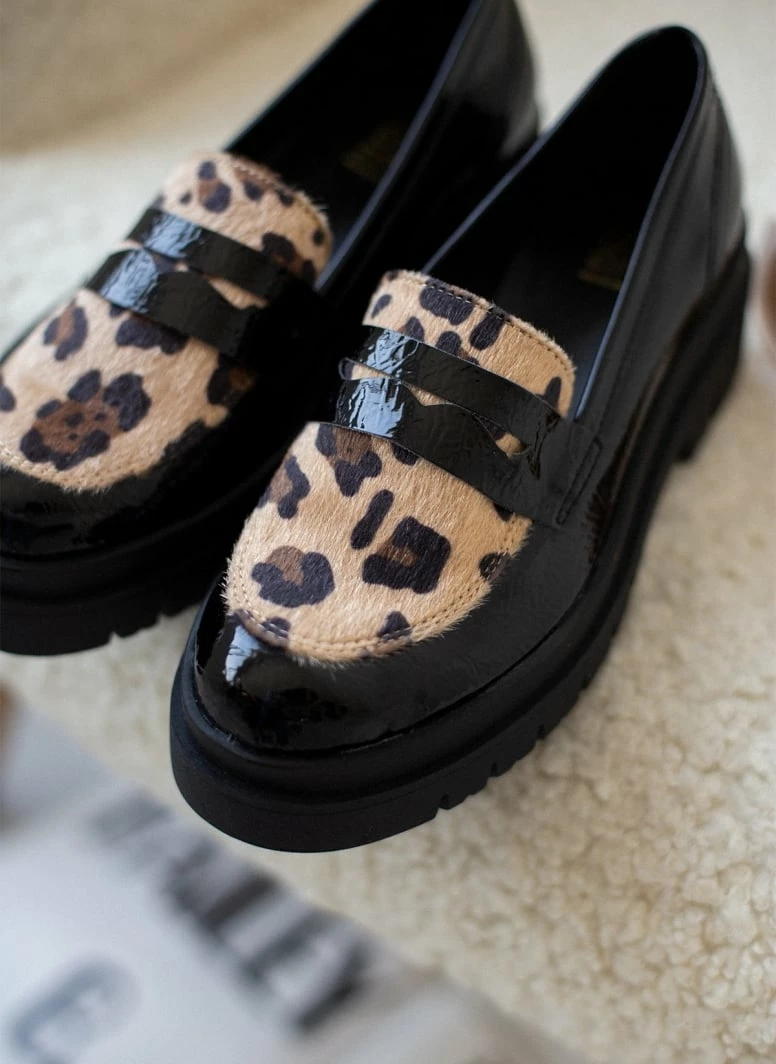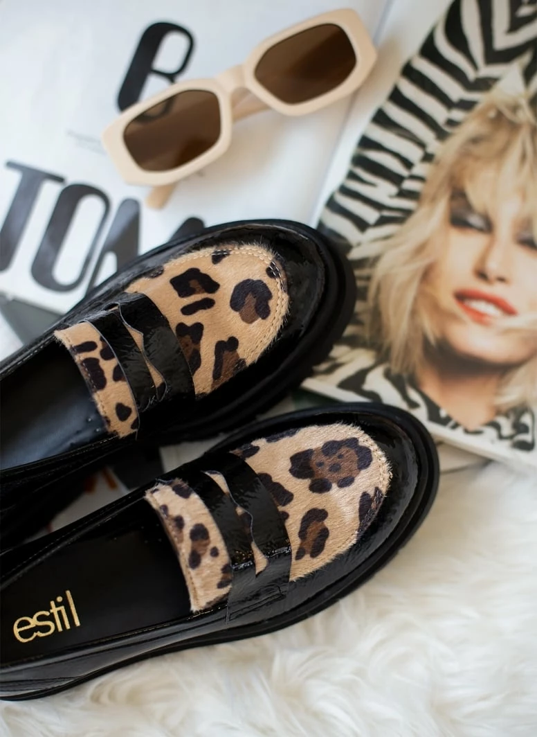 Loafers λουστρίνι estil με ψηλή σόλα. Έχουν animal print λεπτομέρεια από συνθετικό ponyskin. Ελληνικής κατασκευής.