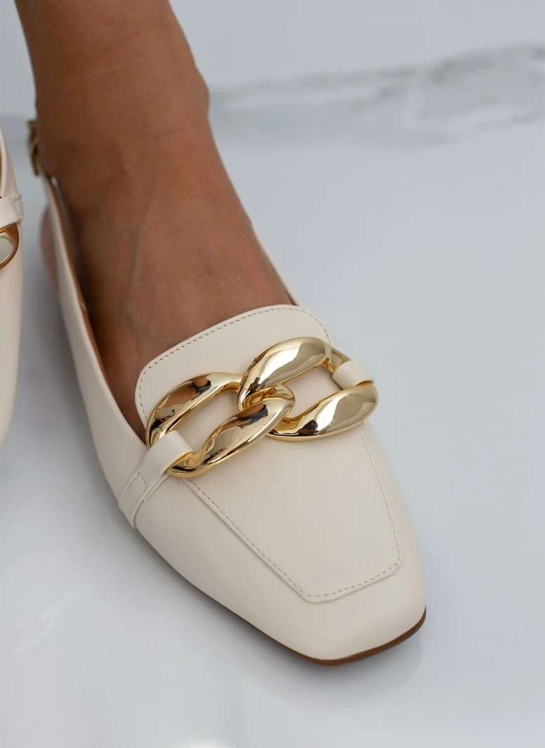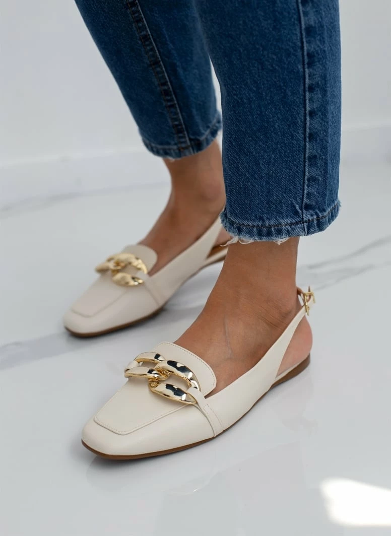 Loafers VIZZANO με ανοιχτή φτέρνα. Δένουν με λουράκι στο πλάι. Έχουν αλυσίδα στο επάνω μέρος. Καρέ γραμμή. Διαθέτουν ανατομικό μαξιλαράκι στον πάτο. Σόλα αντιολισθητική με λάστιχο.
