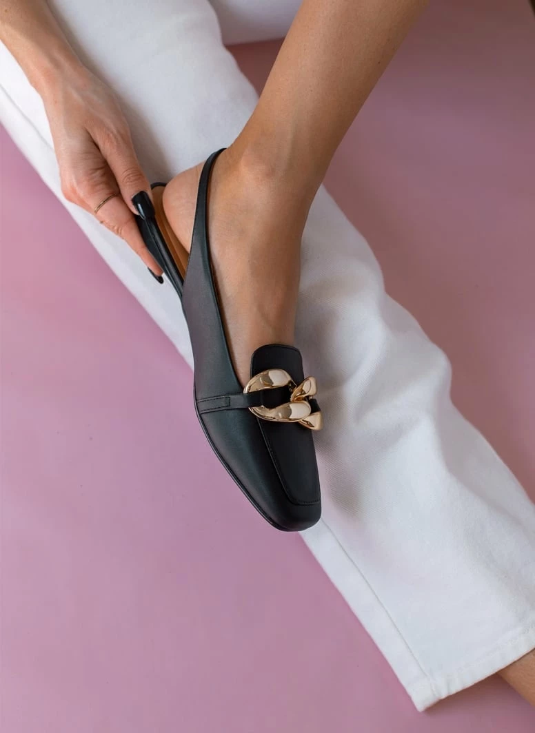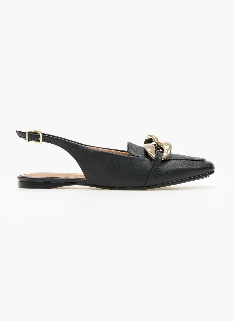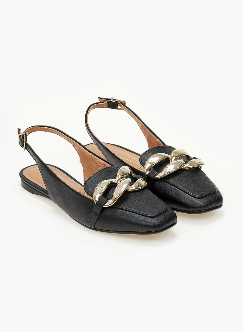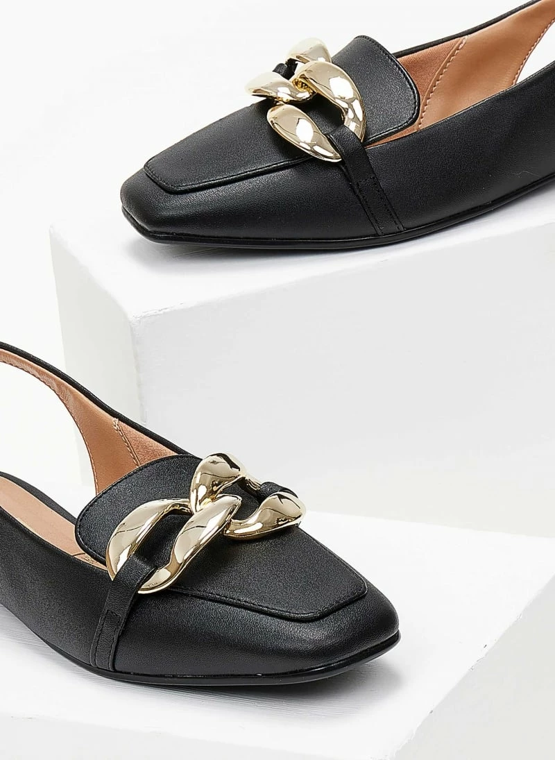 Loafers VIZZANO με ανοιχτή φτέρνα. Δένουν με λουράκι στο πλάι. Έχουν αλυσίδα στο επάνω μέρος. Καρέ γραμμή. Διαθέτουν ανατομικό μαξιλαράκι στον πάτο. Σόλα αντιολισθητική με λάστιχο.