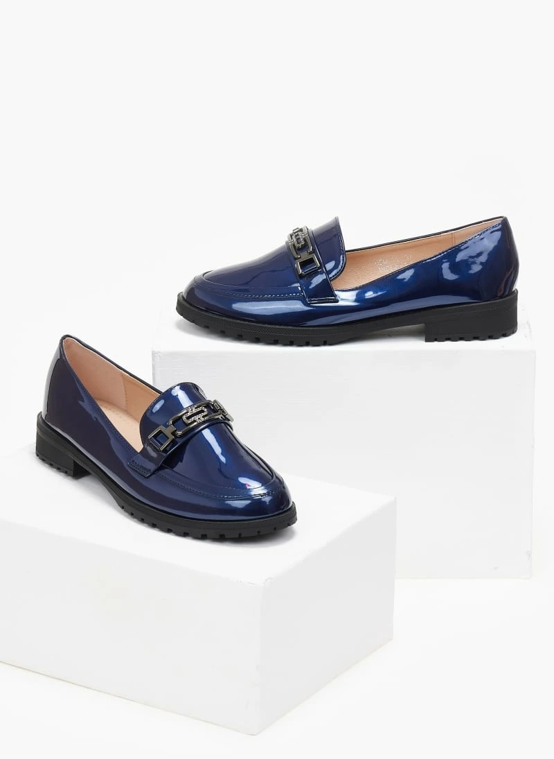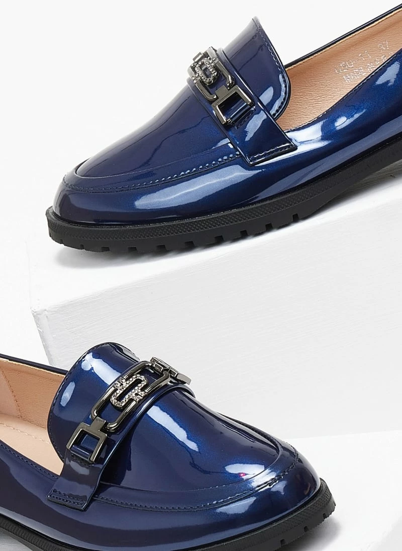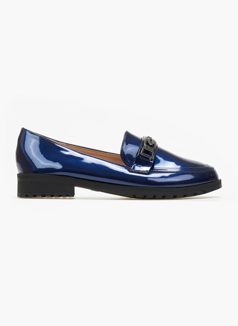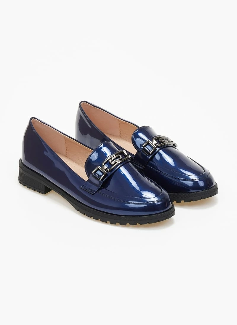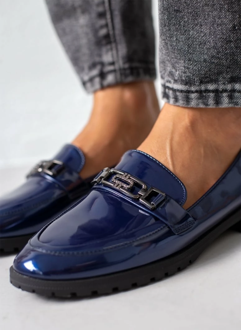 Loafers λουστρίνι με λεπτή τρακτερωτή σόλα. Έχει μεταλλική αγκράφα με μικρά strass.