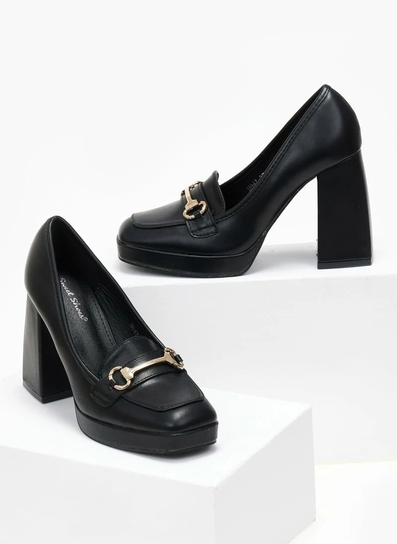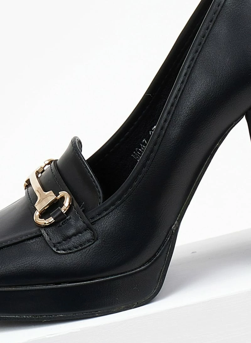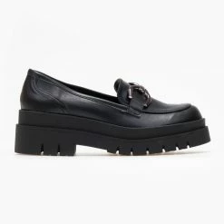 Loafers με λεπτή φιάπα και ιδιαίτερο τακούνι. Έχουν εξωτερική ραφή και μεταλλικό διακοσμητικό.
