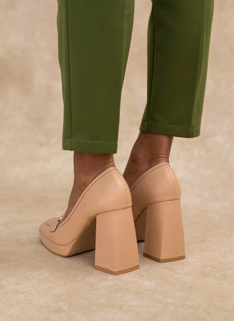 Loafers με λεπτή φιάπα και ιδιαίτερο τακούνι. Έχουν εξωτερική ραφή και μεταλλικό διακοσμητικό.
