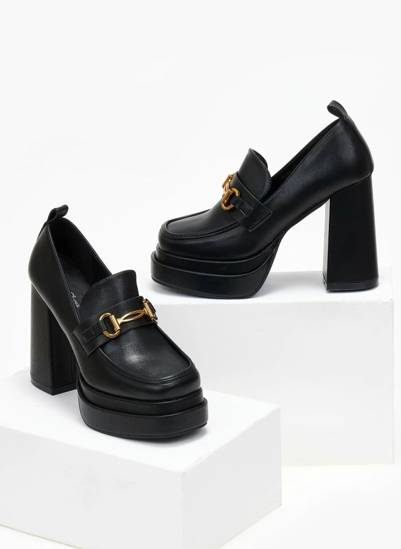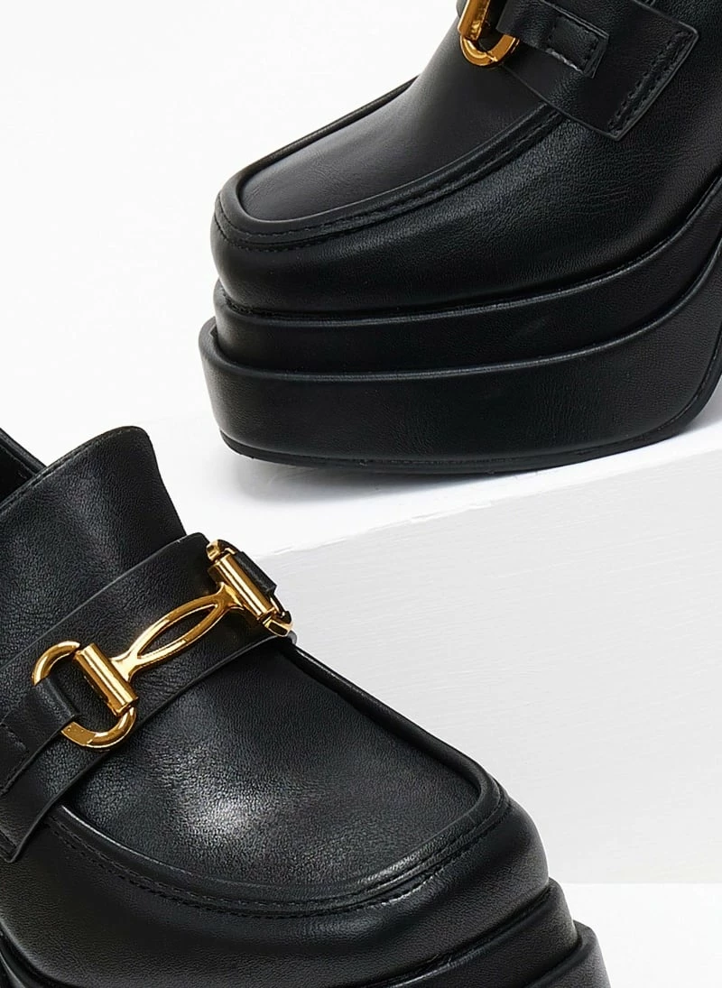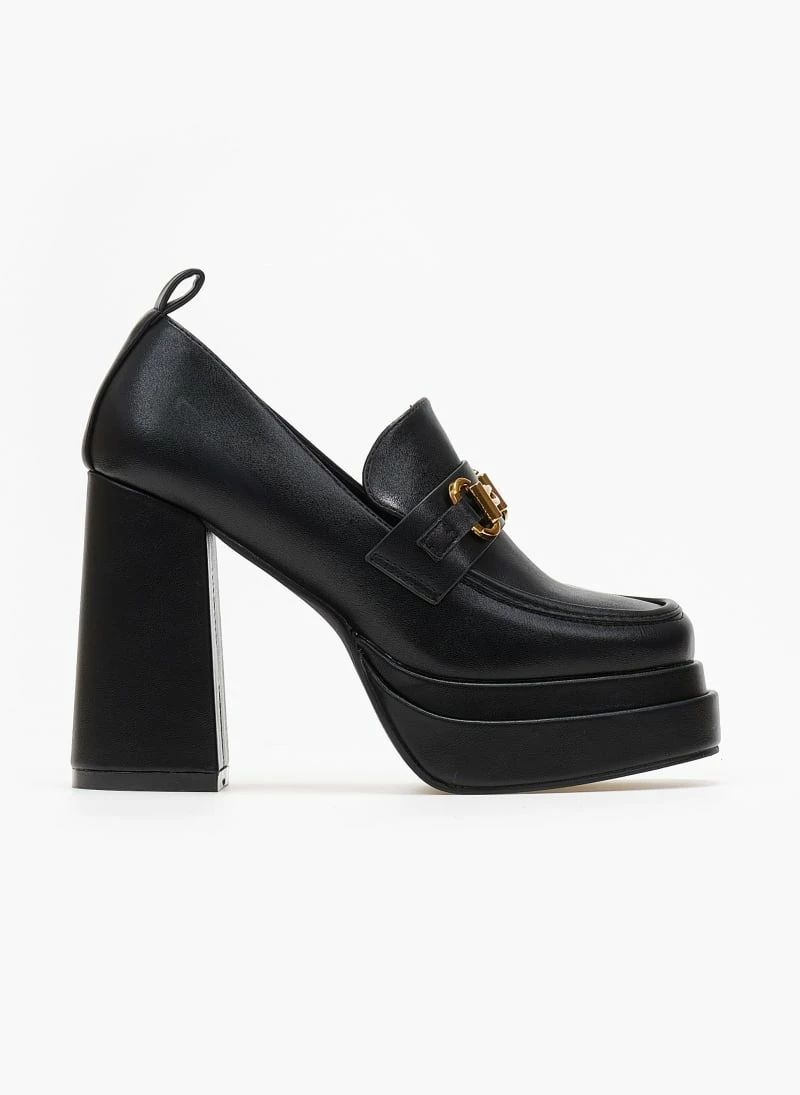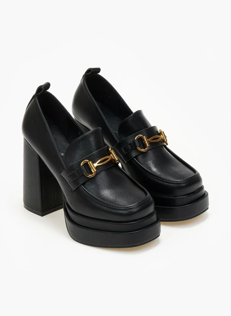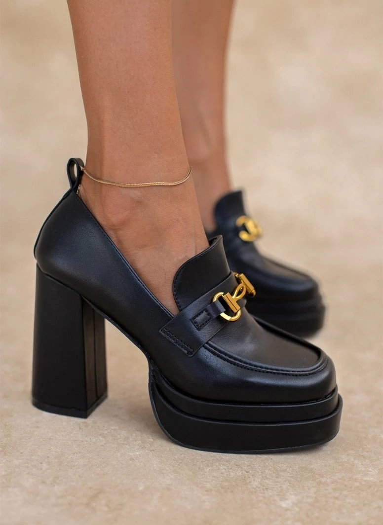 Loafers με ψηλό ιδιαίτερο τακούνι και ψηλή φιάπα. Έχουν ανοίγματα στο πλάι και μεταλλικό διακοσμητικό.