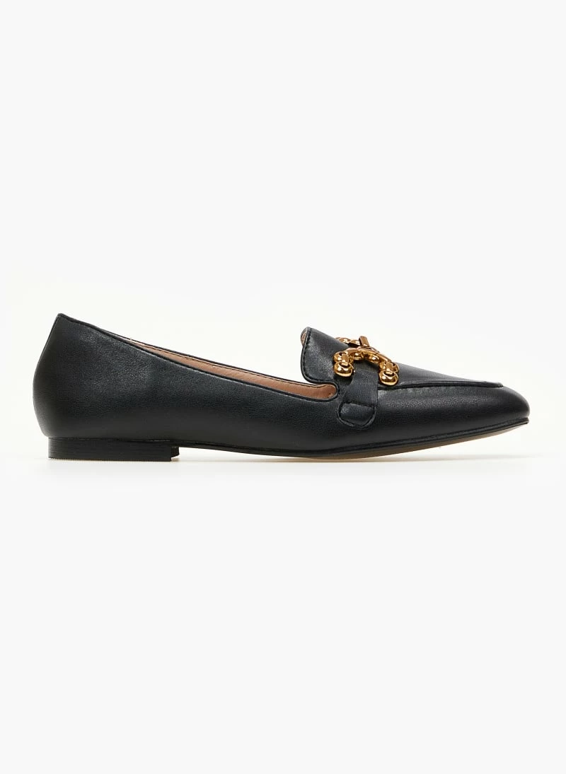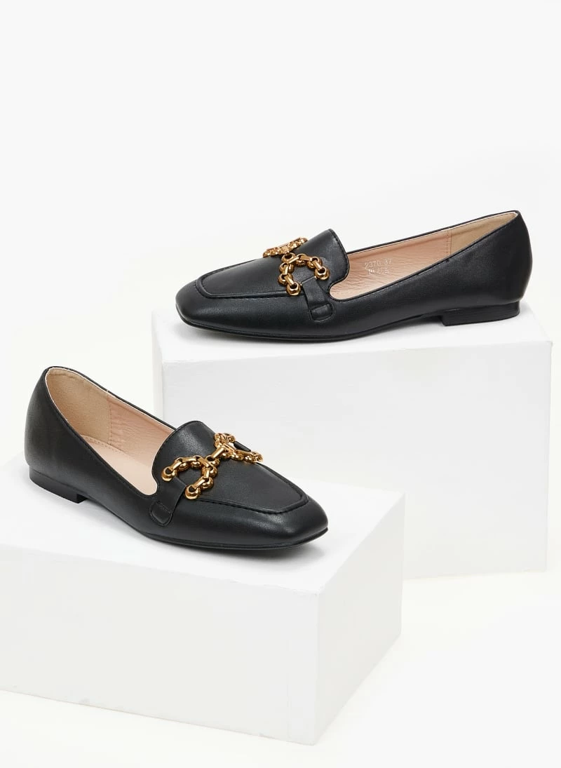 Loafers σε καρέ γραμμή. Έχουν μεταλλικό διακοσμητικό και εξωτερική ραφή στη μπροστινή πλευρά.