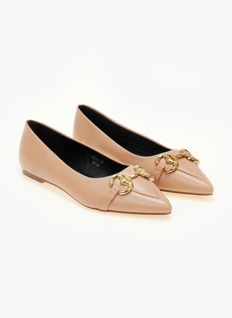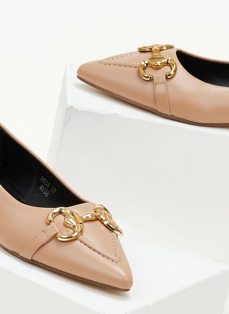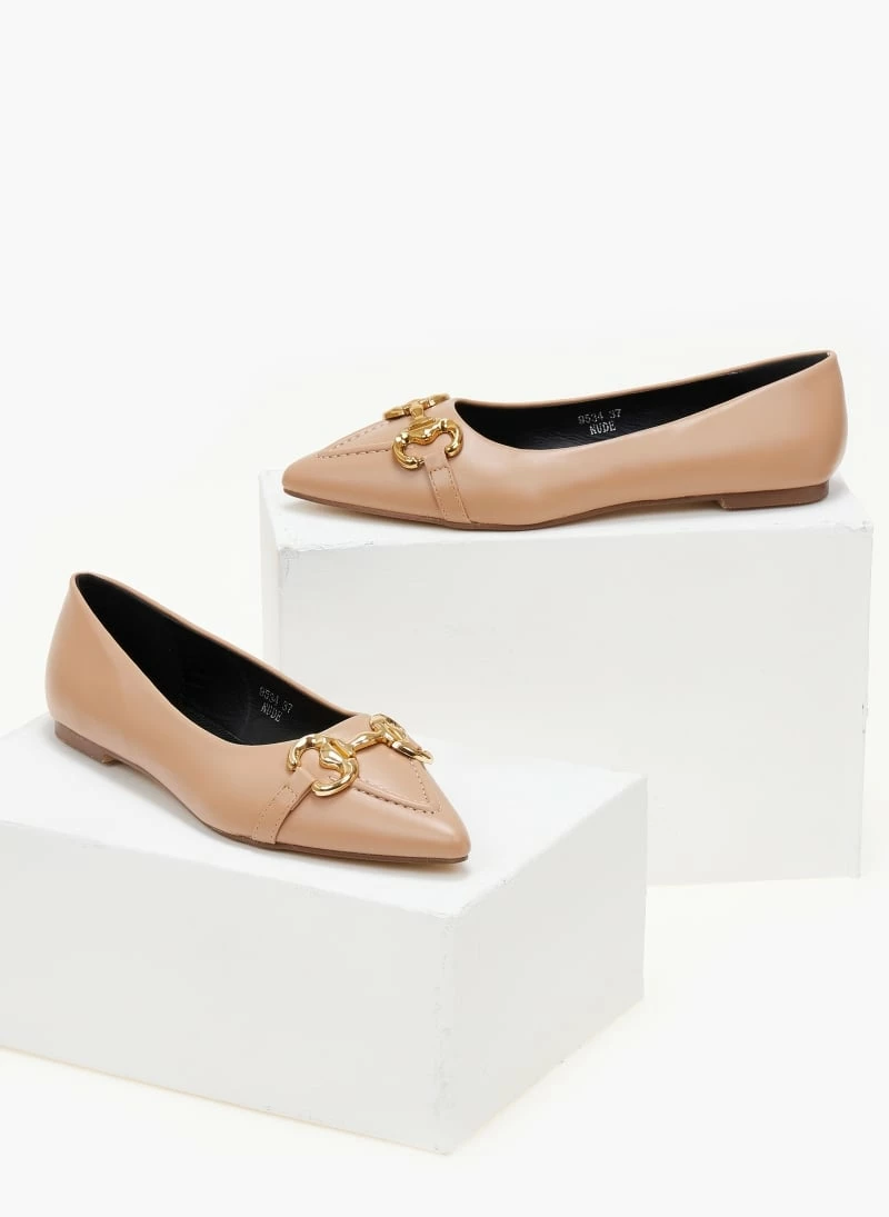 Μυτερές μπαλαρίνες χωρίς τακούνι με μεταλλικό διακοσμητικό. Έχουν εξωτερική ραφή στη μπροστινή πλευρά.