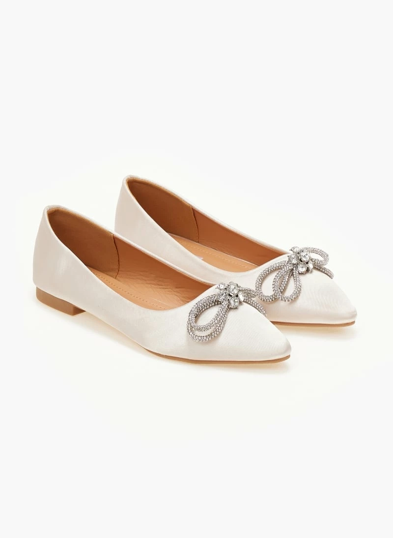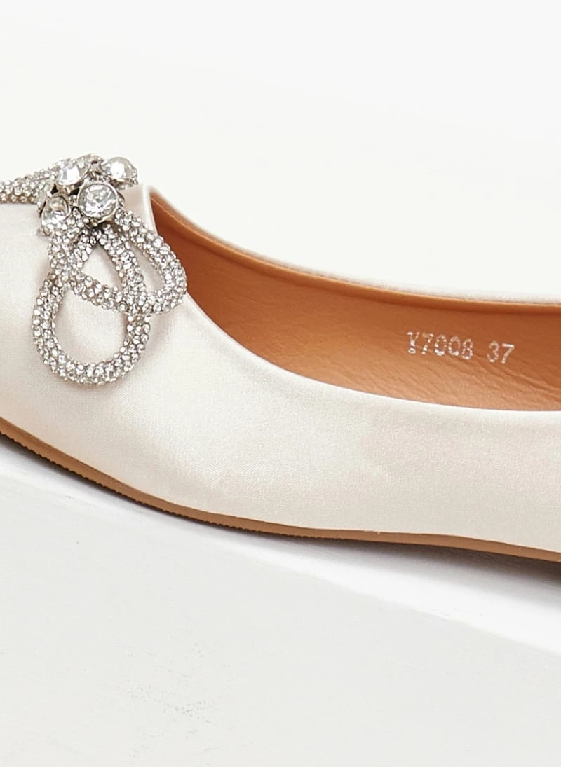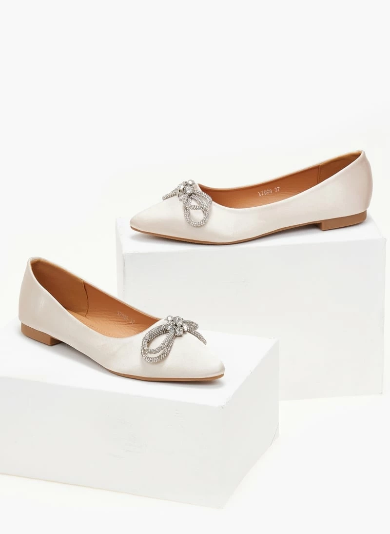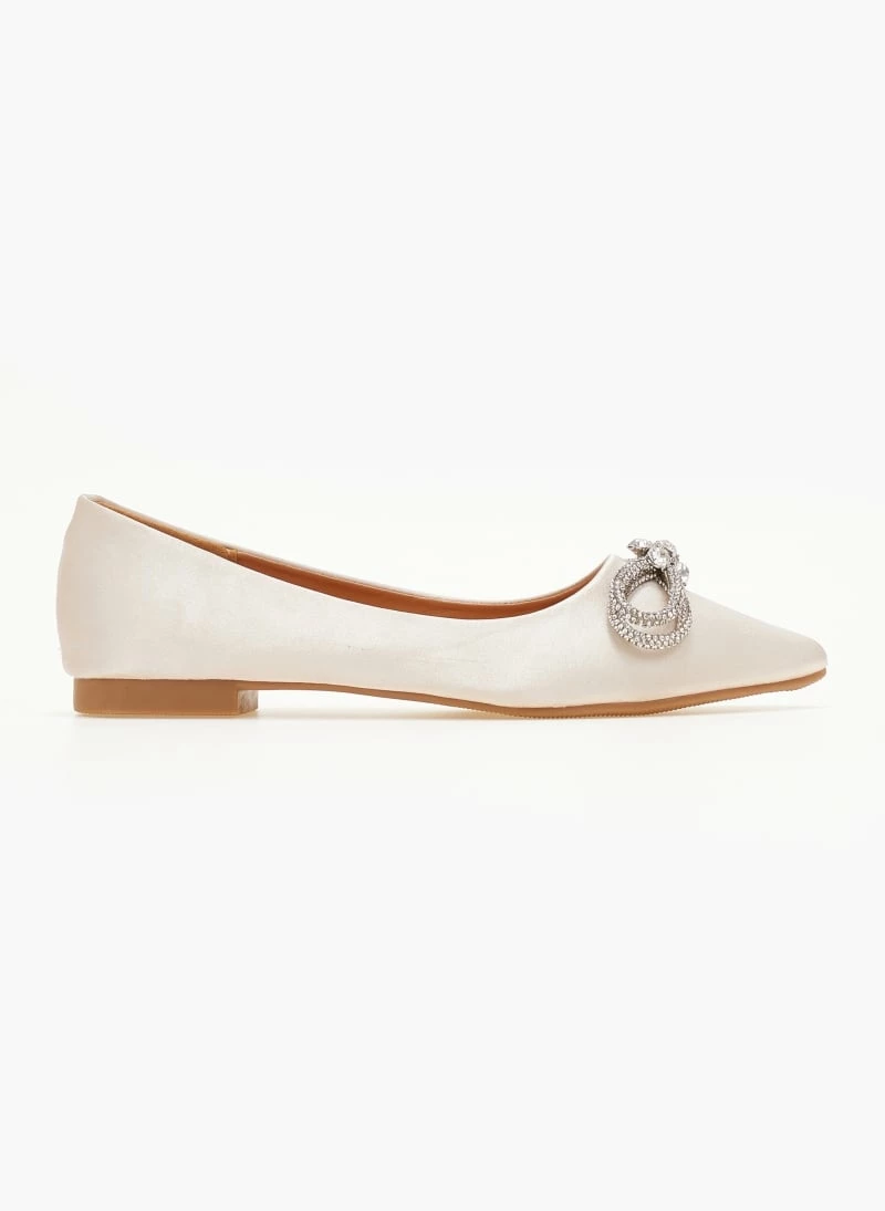 Μπαλαρίνες μυτερές σατέν χωρίς τακούνι. Έχουν strass φιογκάκι. Μαλακή σόλα από λάστιχο.