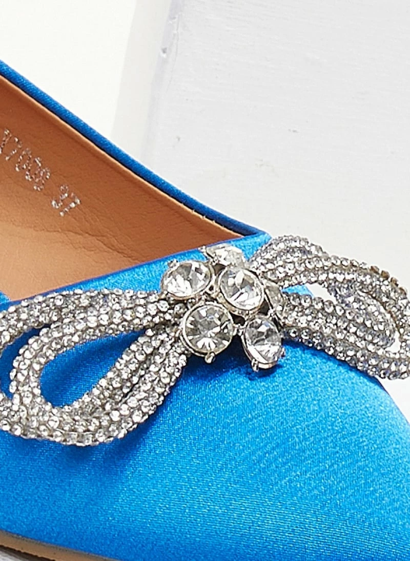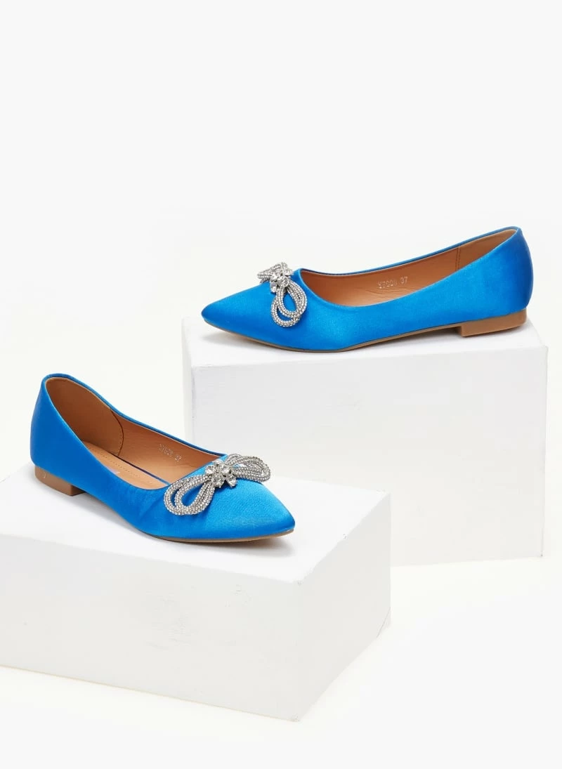 Μπαλαρίνες μυτερές σατέν χωρίς τακούνι. Έχουν strass φιογκάκι. Μαλακή σόλα από λάστιχο.