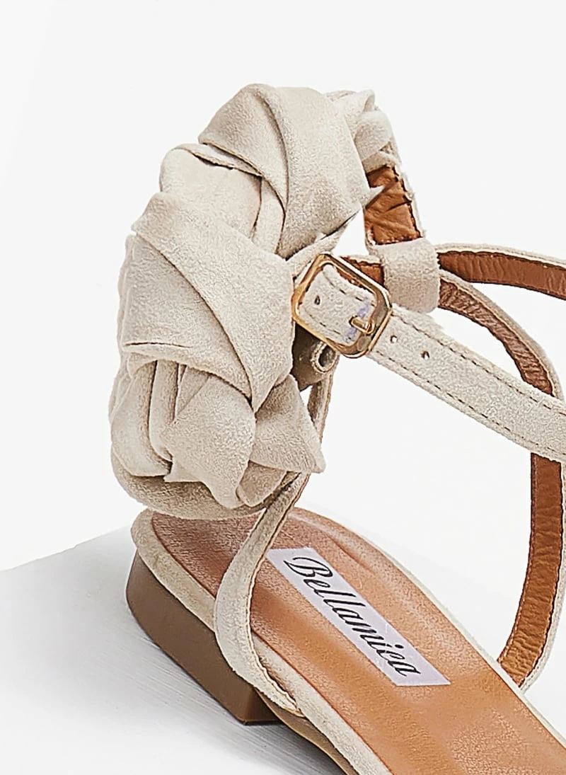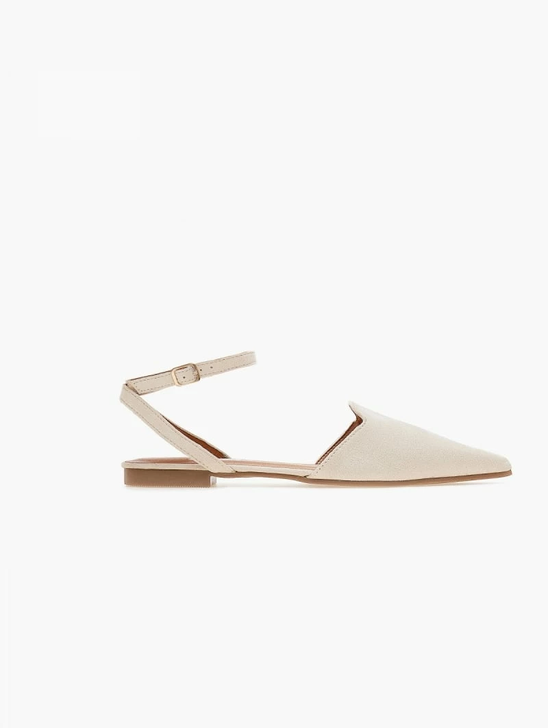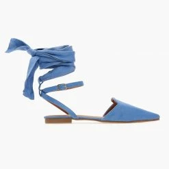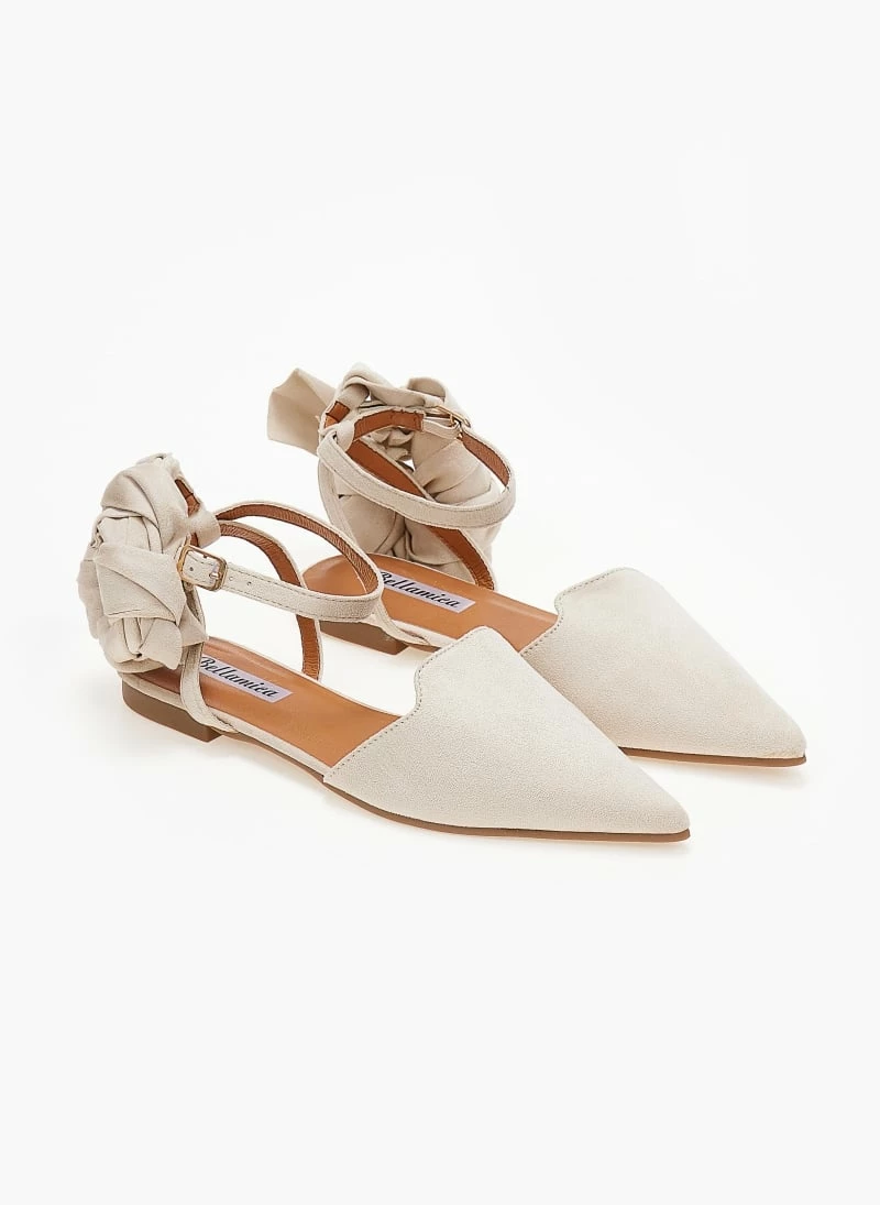 Μπαλαρίνες mules μυτερές suede με μπαρέτα. Δένουν με φαρδιά κορδέλα στη γάμπα. Η κορδέλα μπορεί να αφαιρεθεί.