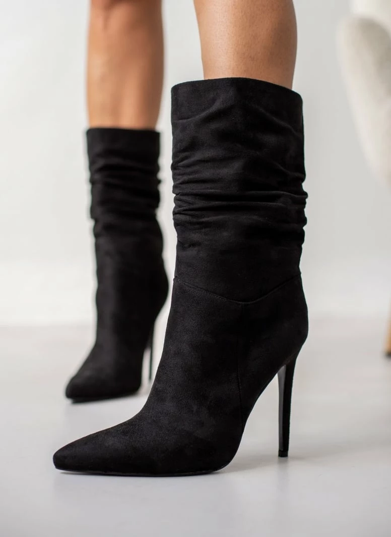 Μυτερά suede μπότες με λεπτό τακούνι. Έχουν μικρές σόυρες στο ύψος της γάμπας.