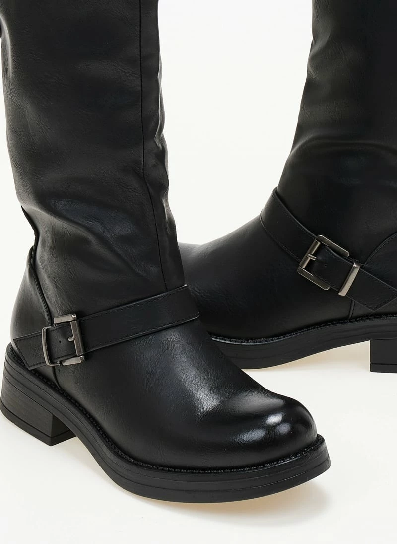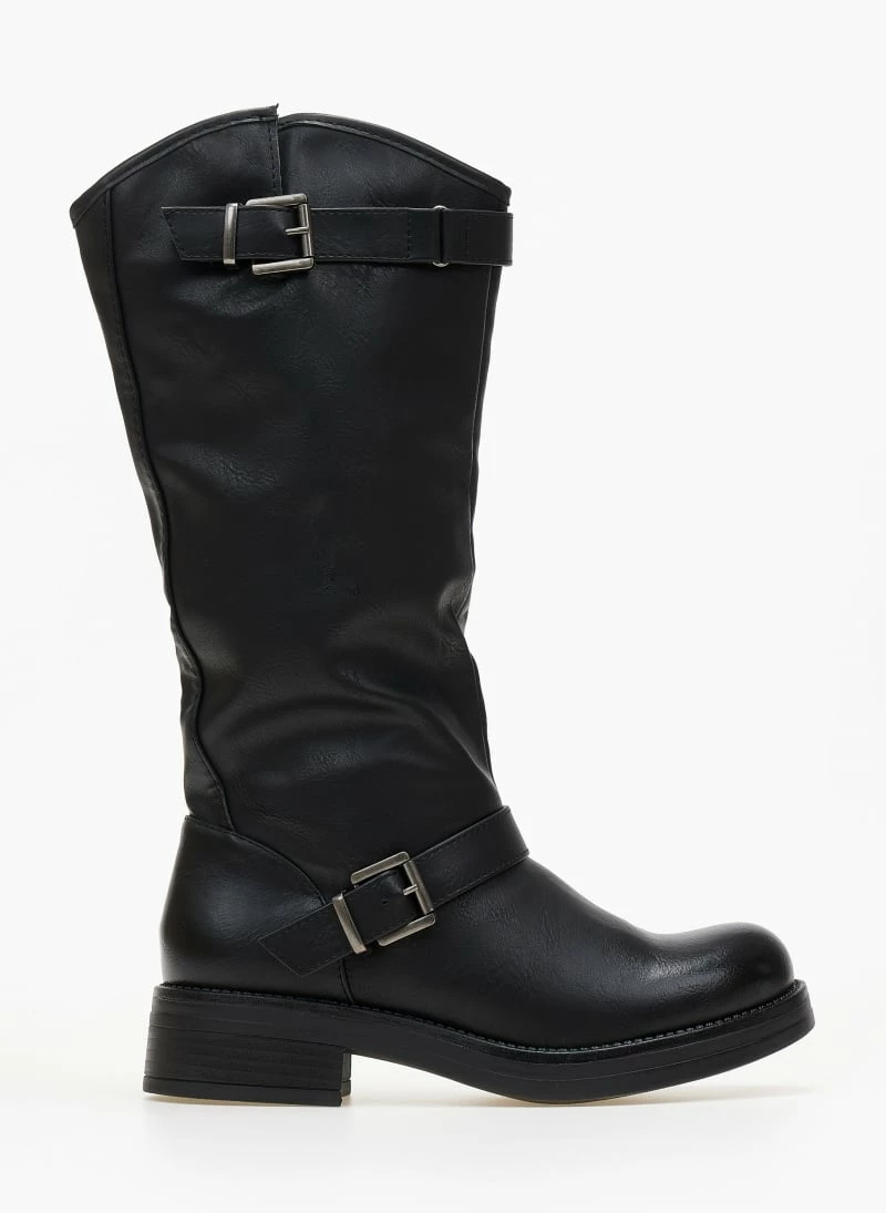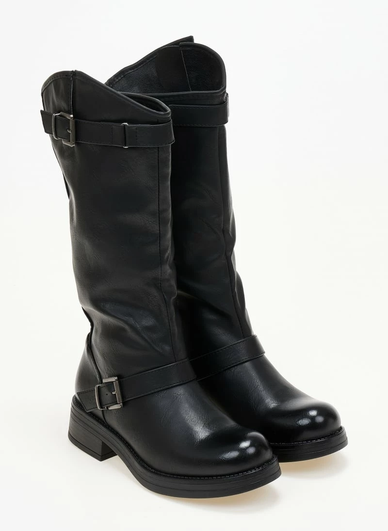 Φλάτ μπότες με ζωνάκια. Διαθέτει δύο διακοσμητικά ζωνάκια στην εξωτερική πλευρά του παπουτσιού. Έχει στρογγυλή μύτη και άνισο τελείωμα.