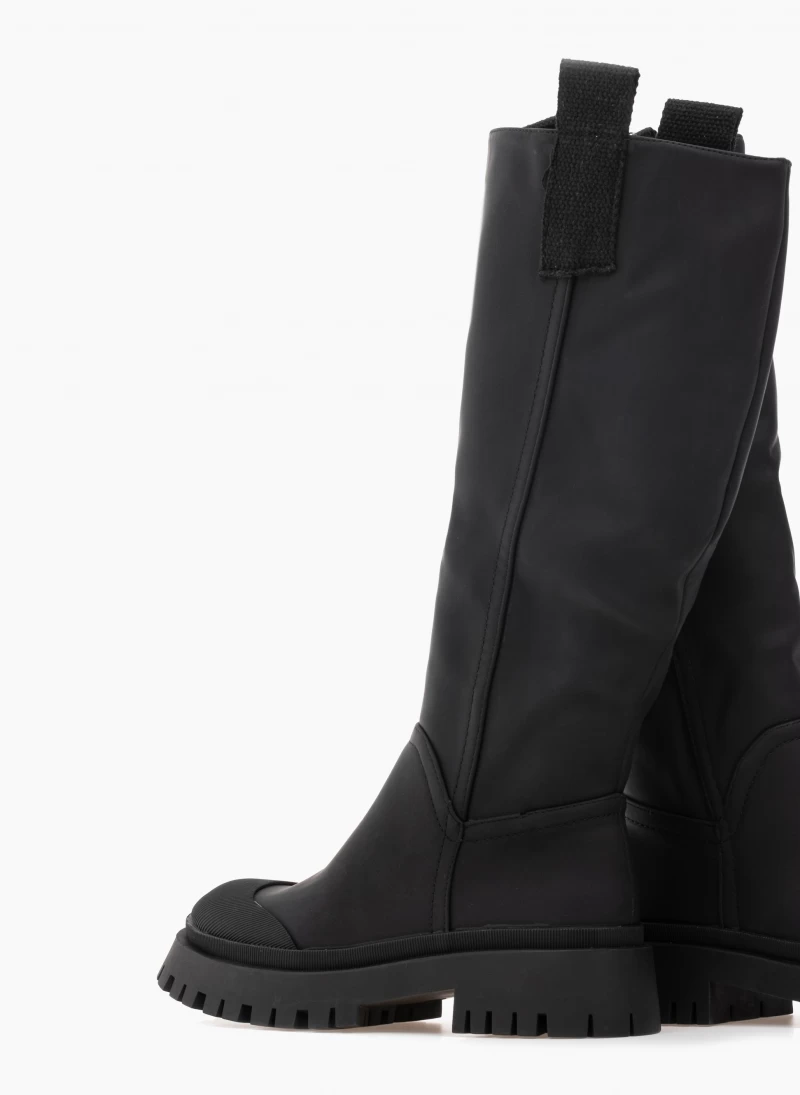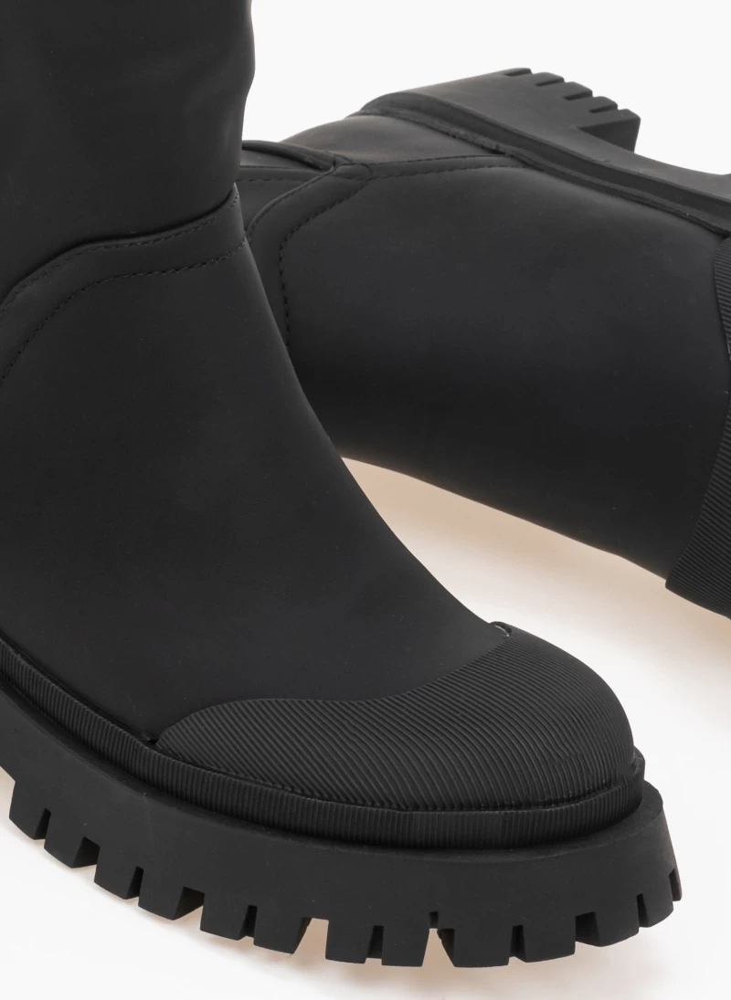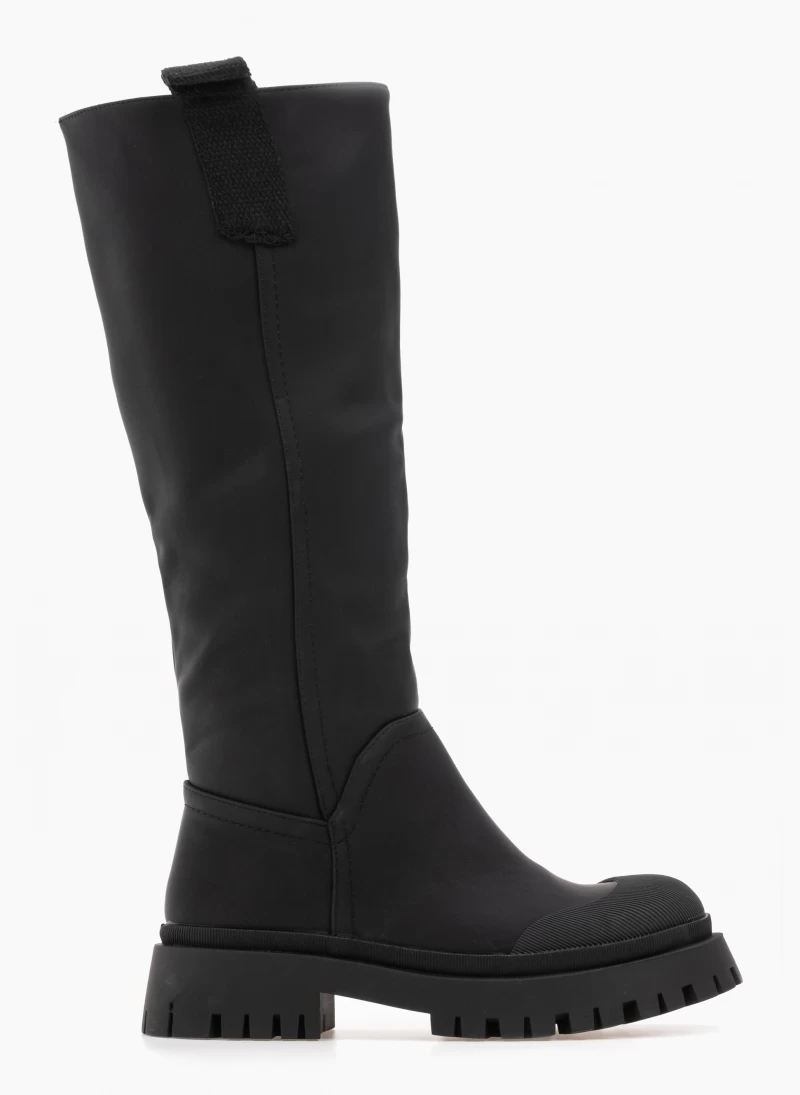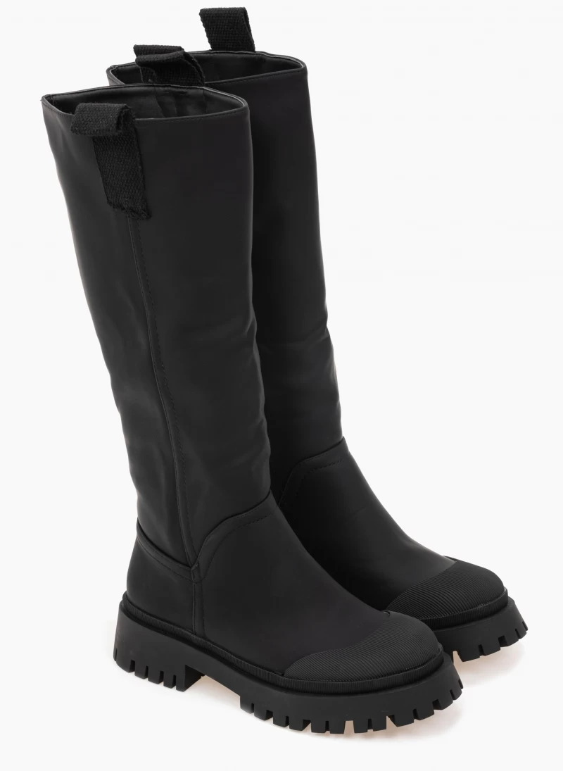 Ματ casual μπότες με υφασμάτινο θηλάκι στο απάνω μέρος. Έχουν ανάγλυφο σχέδιο στη μπροστινή πλευρά και περιμετρικά της σόλας. Chunky σόλα.