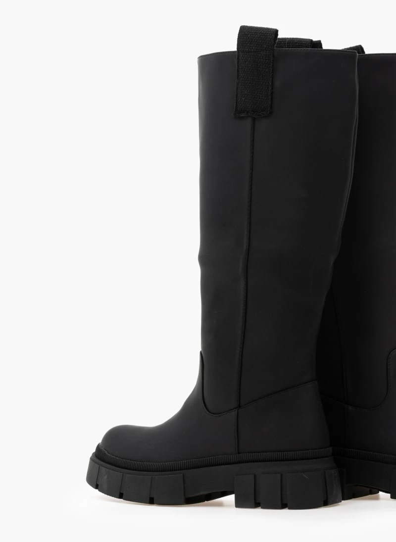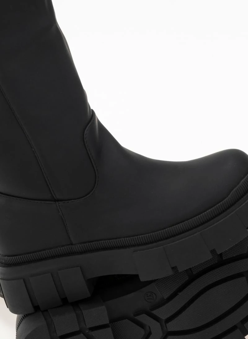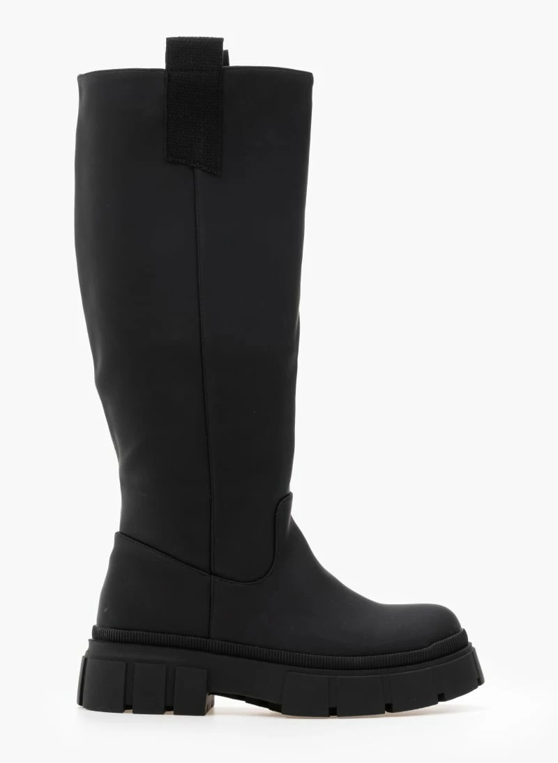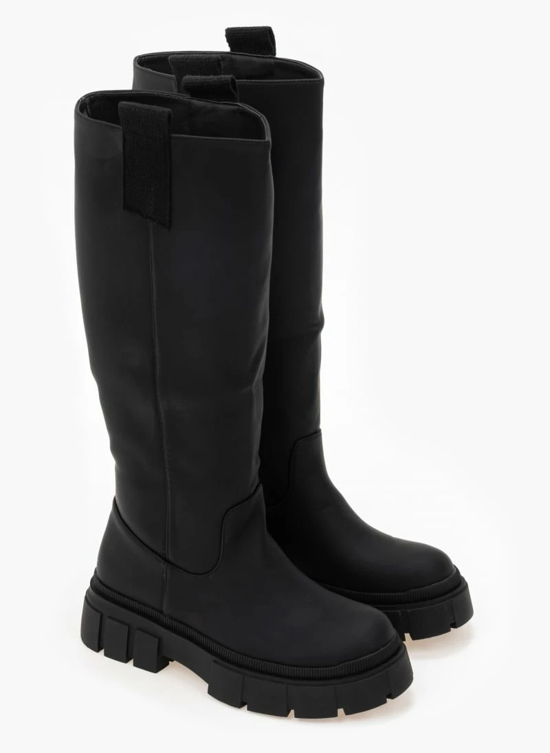 Μπότες ίσιες με chunky σόλα. Έχει θηλάκια στο τελείωμα. Στρογγυλή γραμμή.