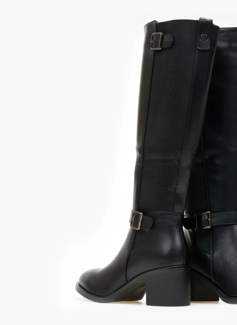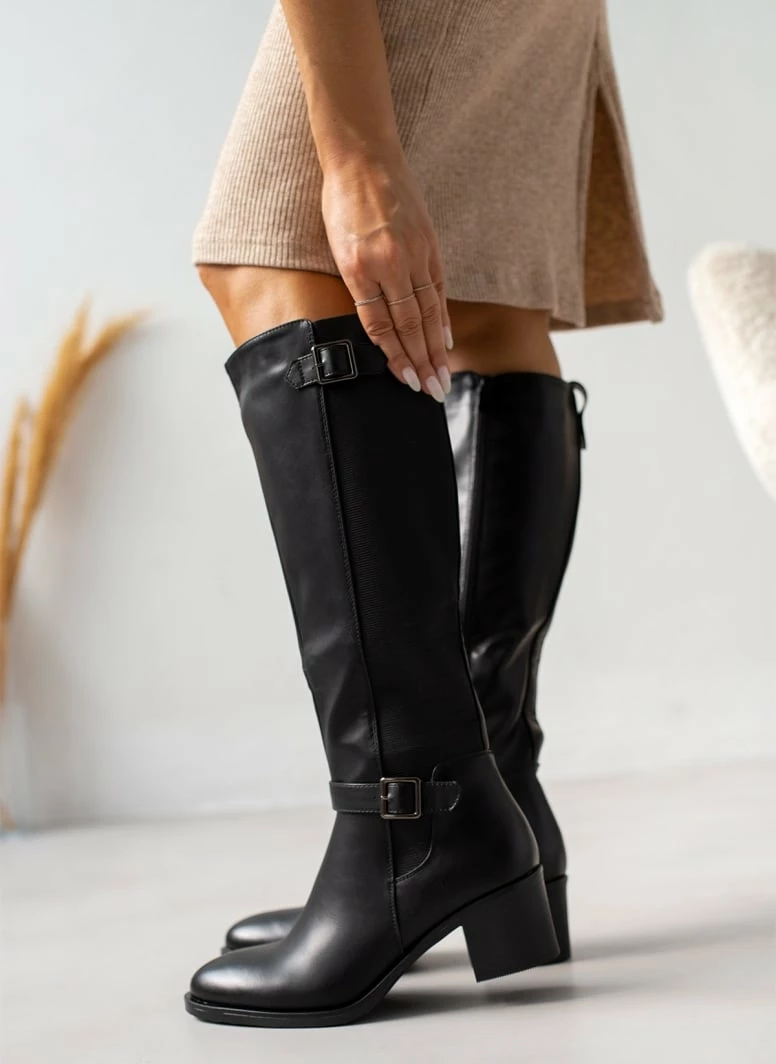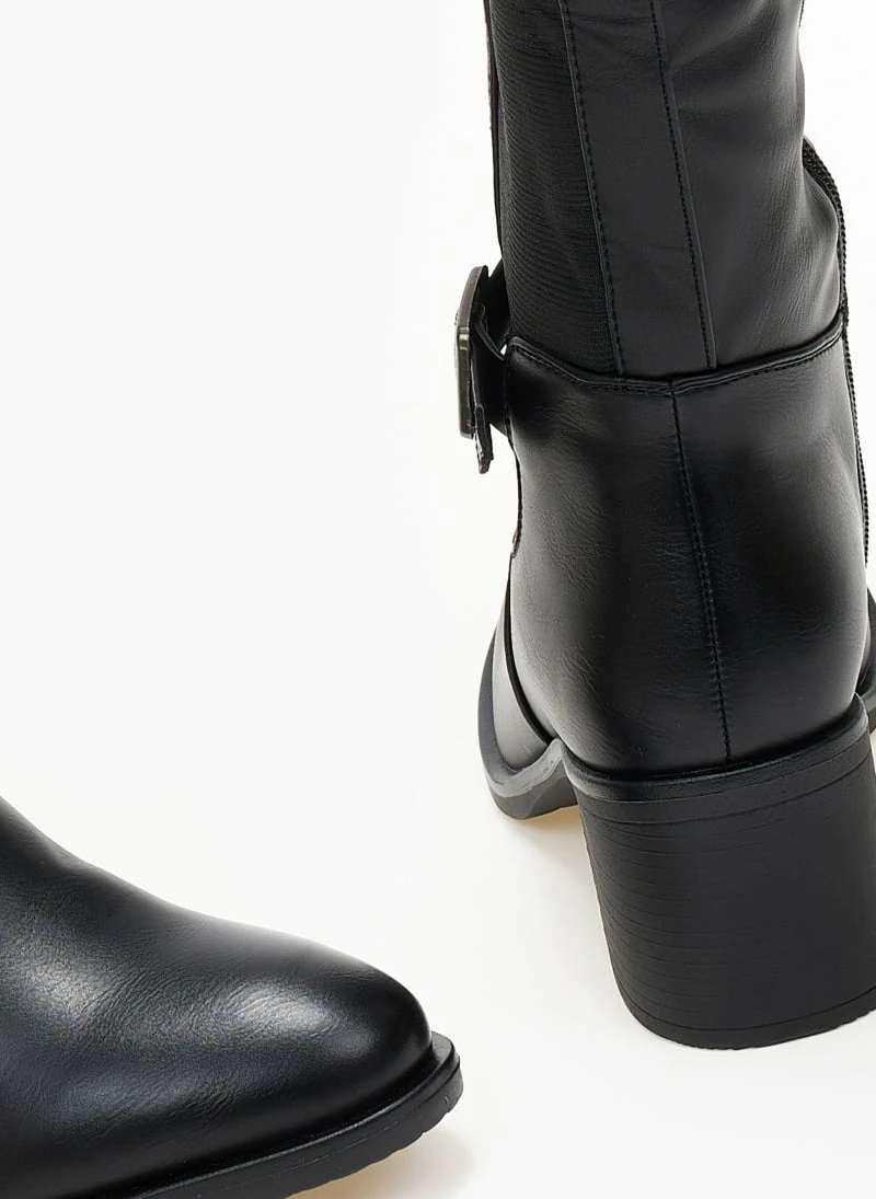 Μπότες ιππασίας με ζωνάκι και μεταλλικό στοιχείο στο ύψος του αστραγάλου. Έχουν χοντρό τετράγωνο τακούνι. Διαθέτουν ελαστικό τμήμα στο πλάι για καλύτερη εφαρμογή. Στρογγυλή γραμμή.
