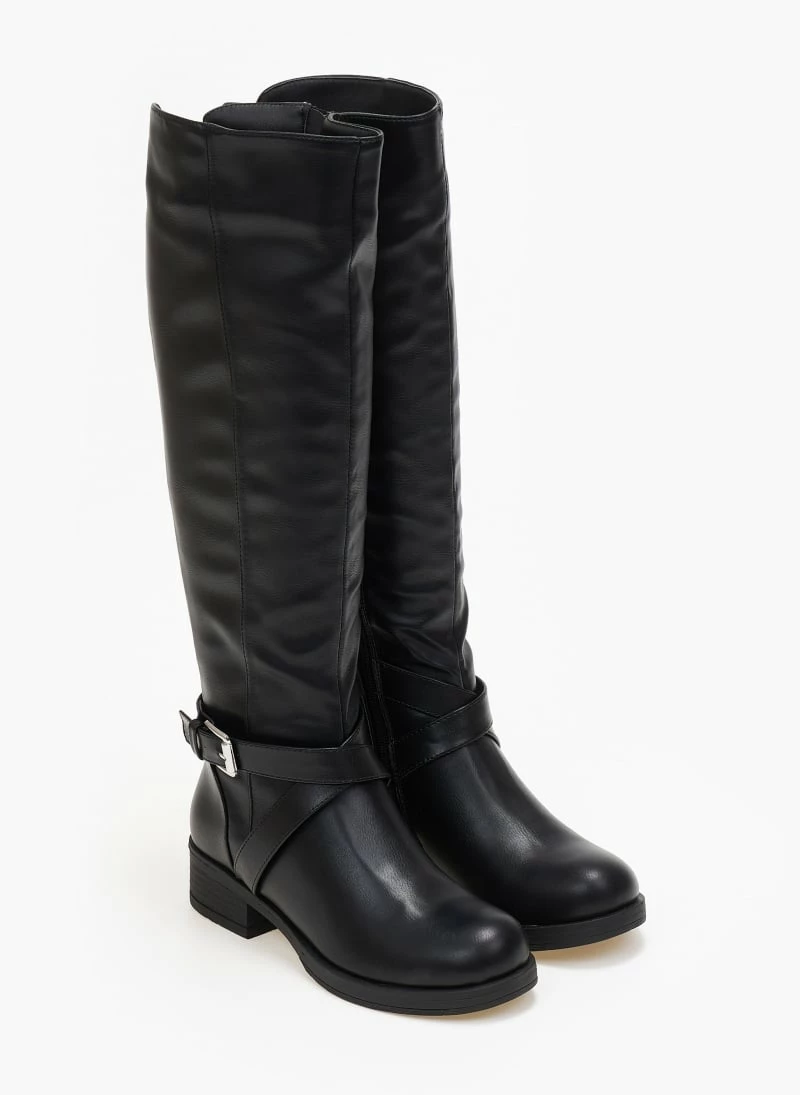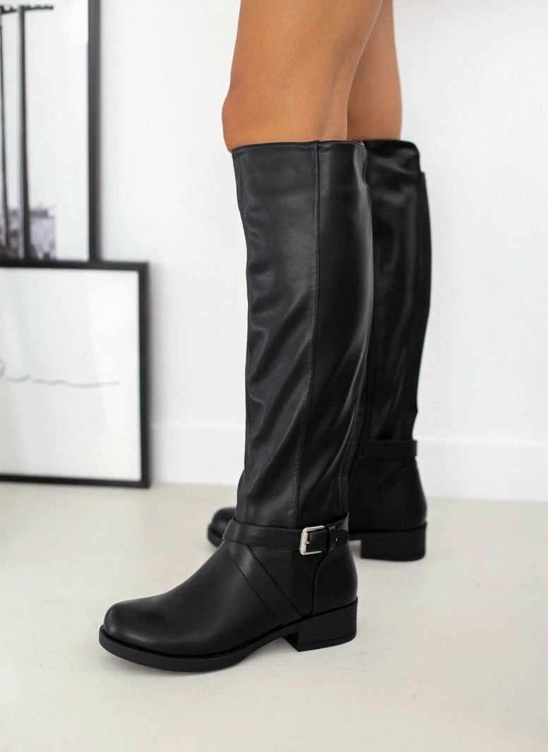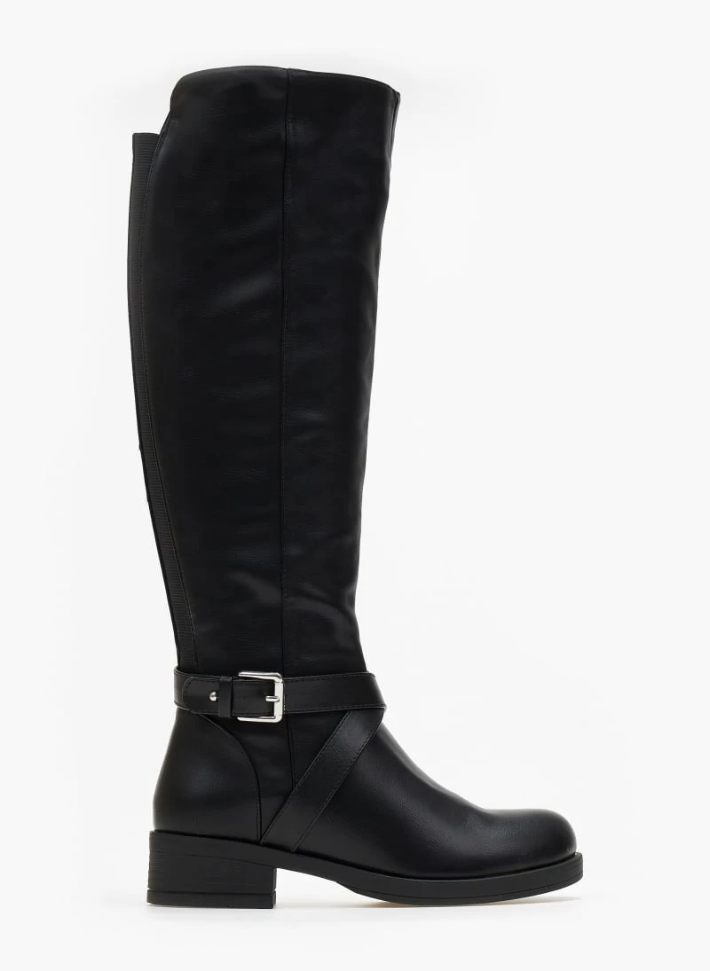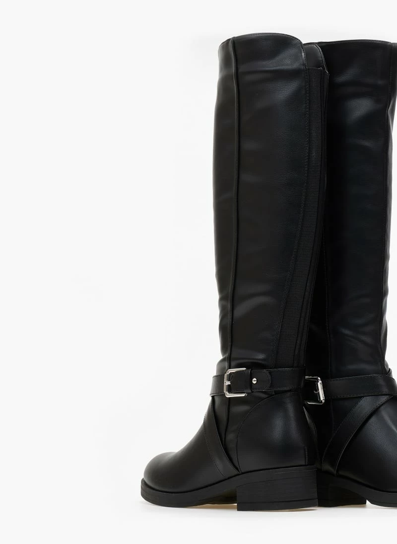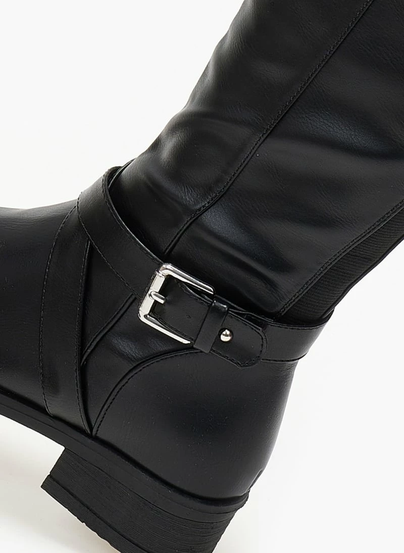 Μπότες ιππασίας με ζωνάκι και μεταλλική αγκράφα. Έχουν λάστιχο στο πίσω μέρος για καλύτερη εφαρμογή. Ασύμμετρο τελείωμα.