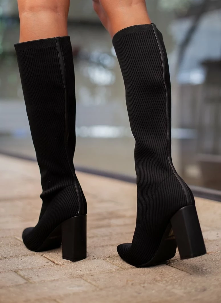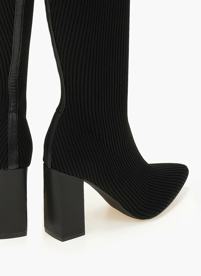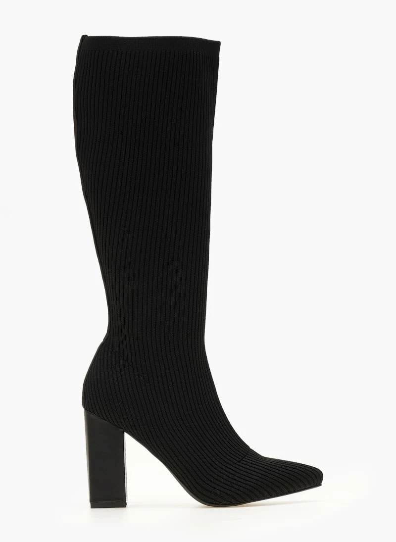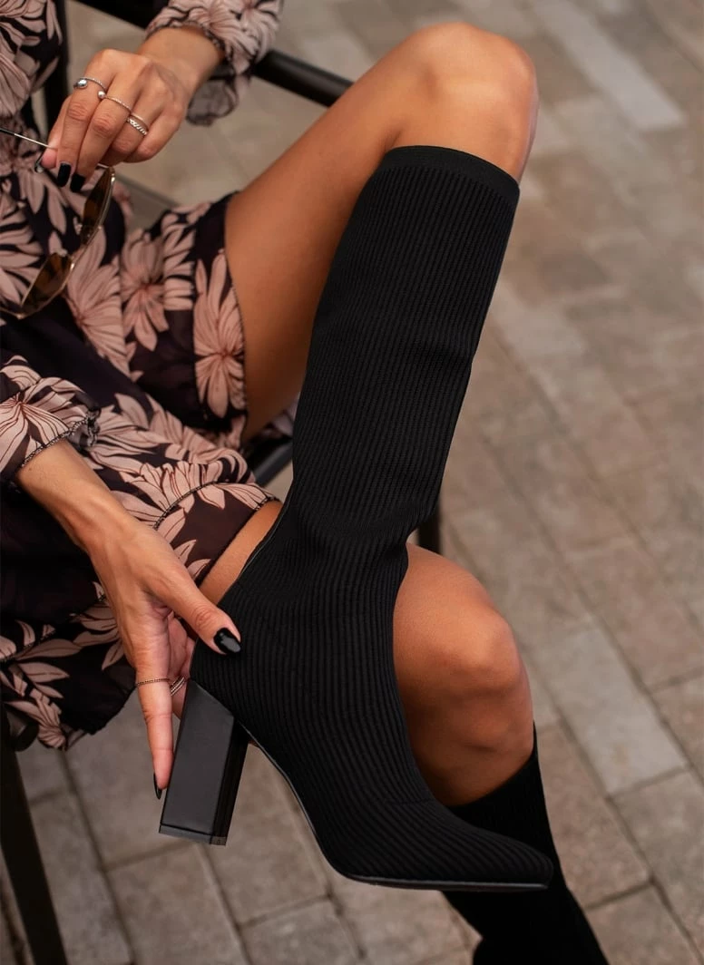 Μπότες κάλτσα από ελαστικό ύφασμα με ανάγλυφο σχέδιο. Έχουν ψηλό χοντρό τακούνι. Μυτερή φόρμα.