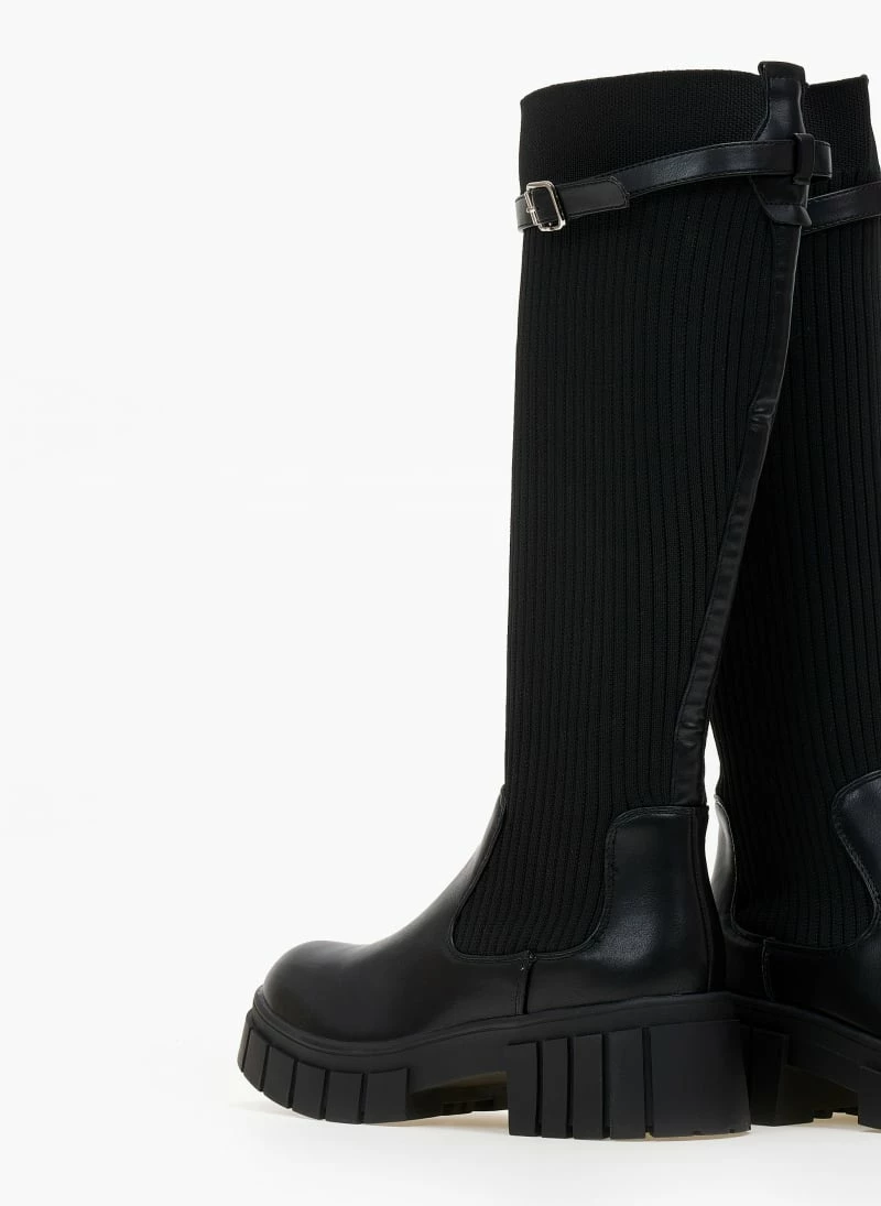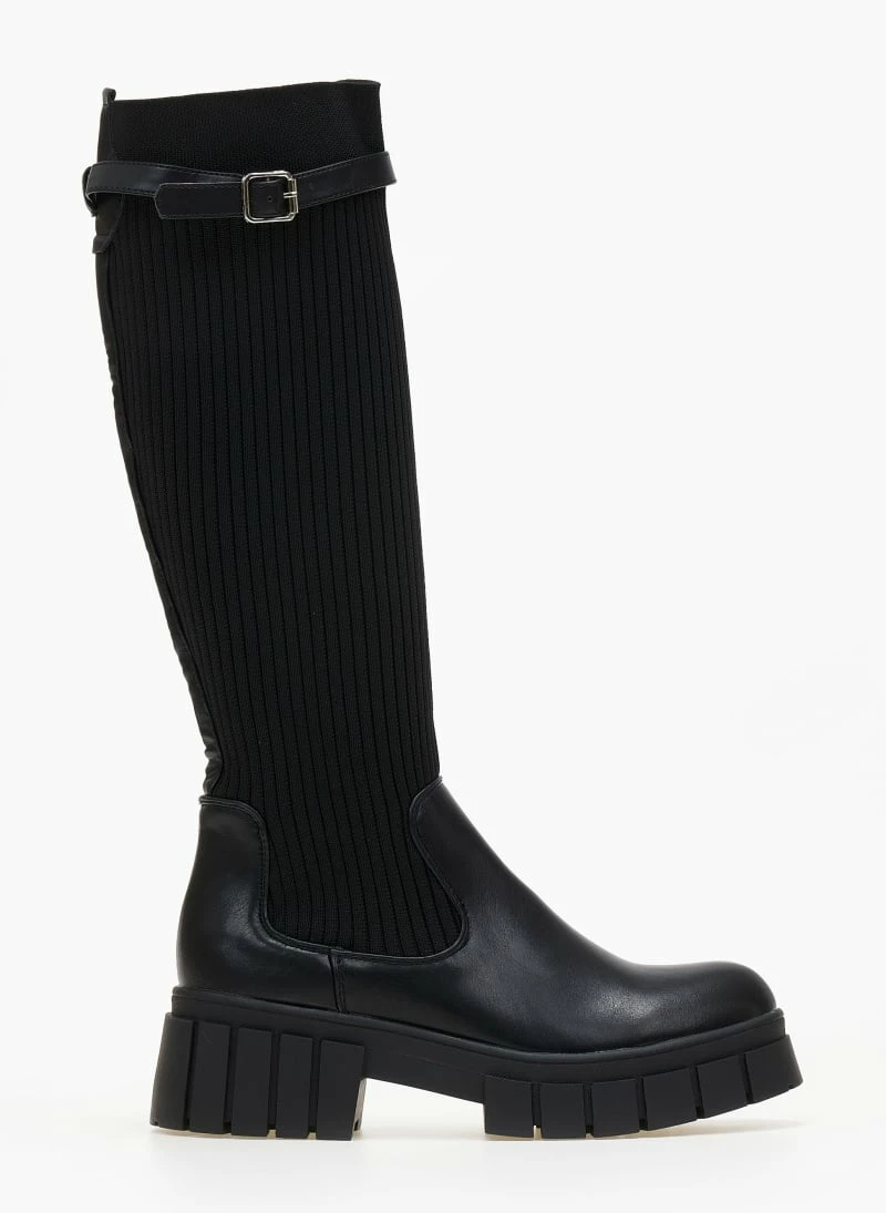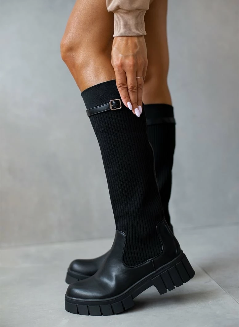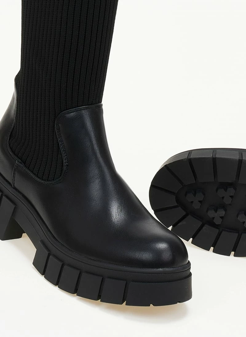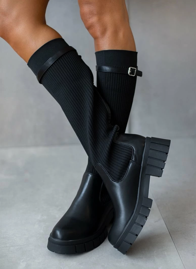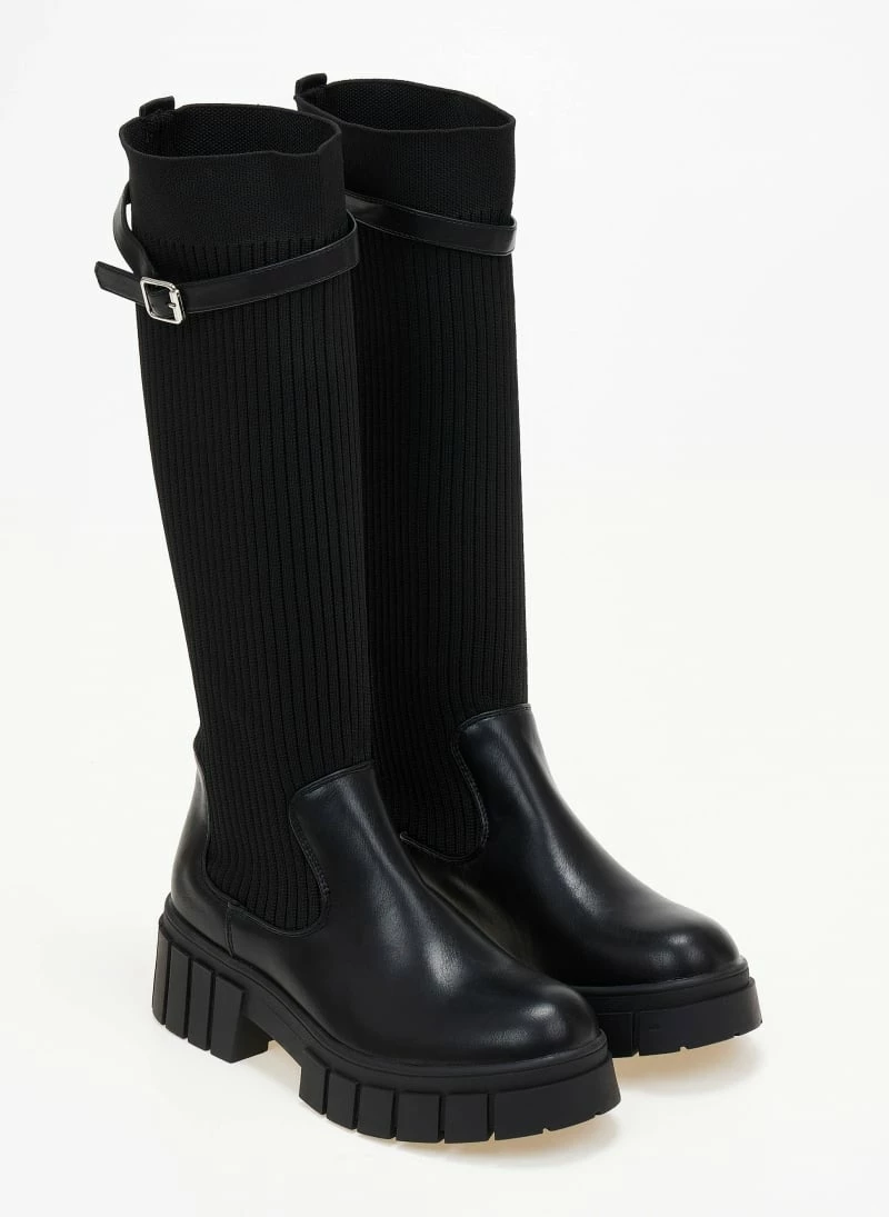 Μπότες με chunky σόλα. Έχουν σχέδιο κάλτσα στη γάμπα. Λεπτό ζωνάκι δερματίνη στο τελείωμα. Στρογγυλή φόρμα.