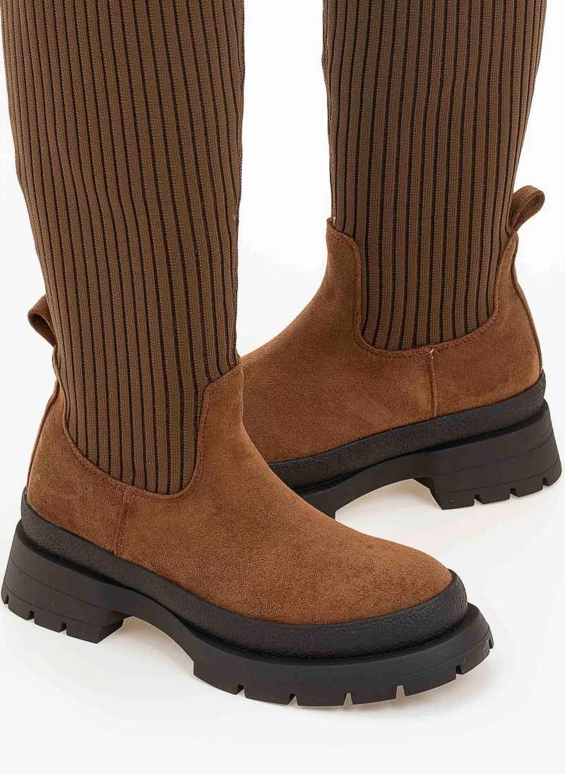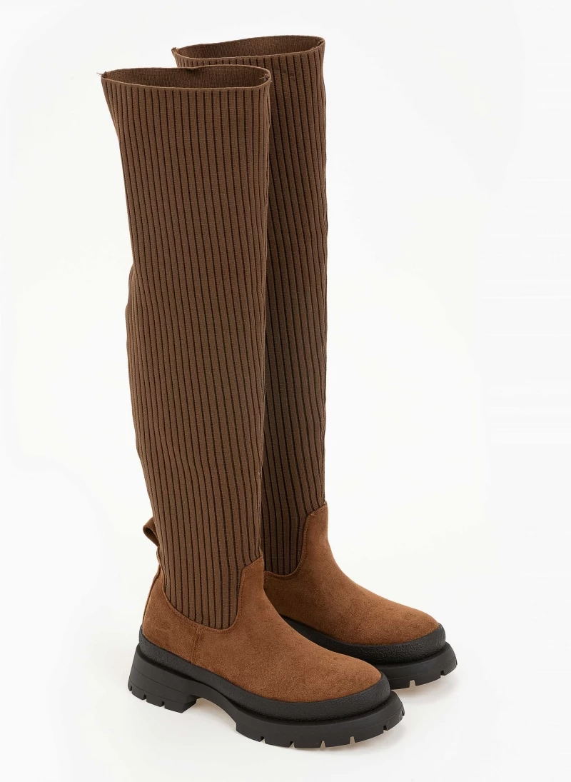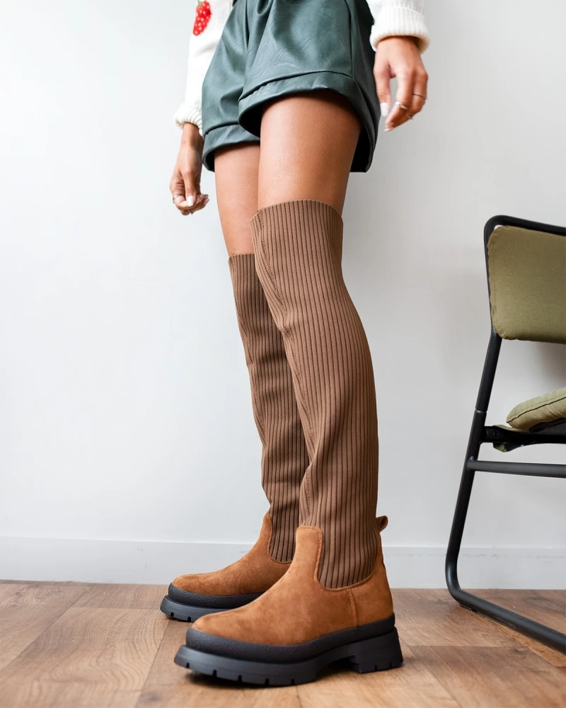 Suede μπότες κάλτσα πάνω από το γόνατο. Έχουν chunky σόλα και θηλάκι στο πίσω μέρος.