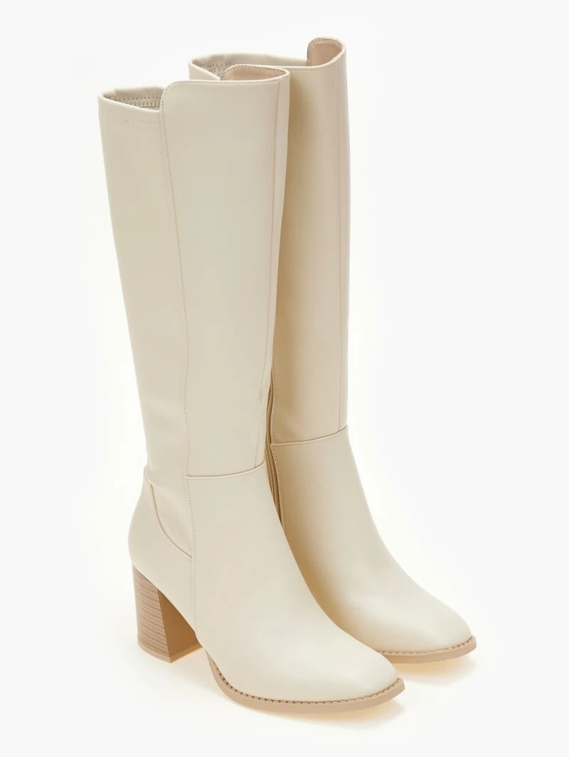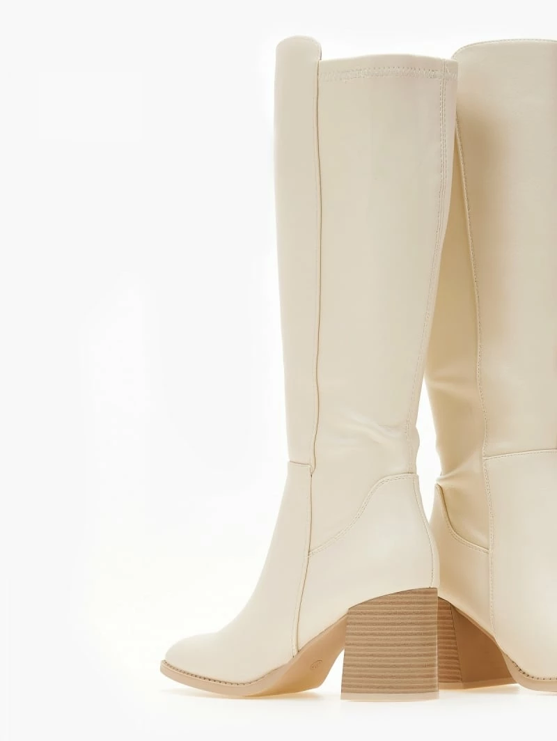 Μπότες με χαμηλό τετράγωνο τακούνι. Είναι ελαστικές στη γάμπα και το τελείωμα είναι ασύμμετρο. Χαμηλό τετράγωνο τακούνι. Έχουν εφέ εξωτερική ραφή περιμετρικά της σόλας. Καρέ γραμμή.