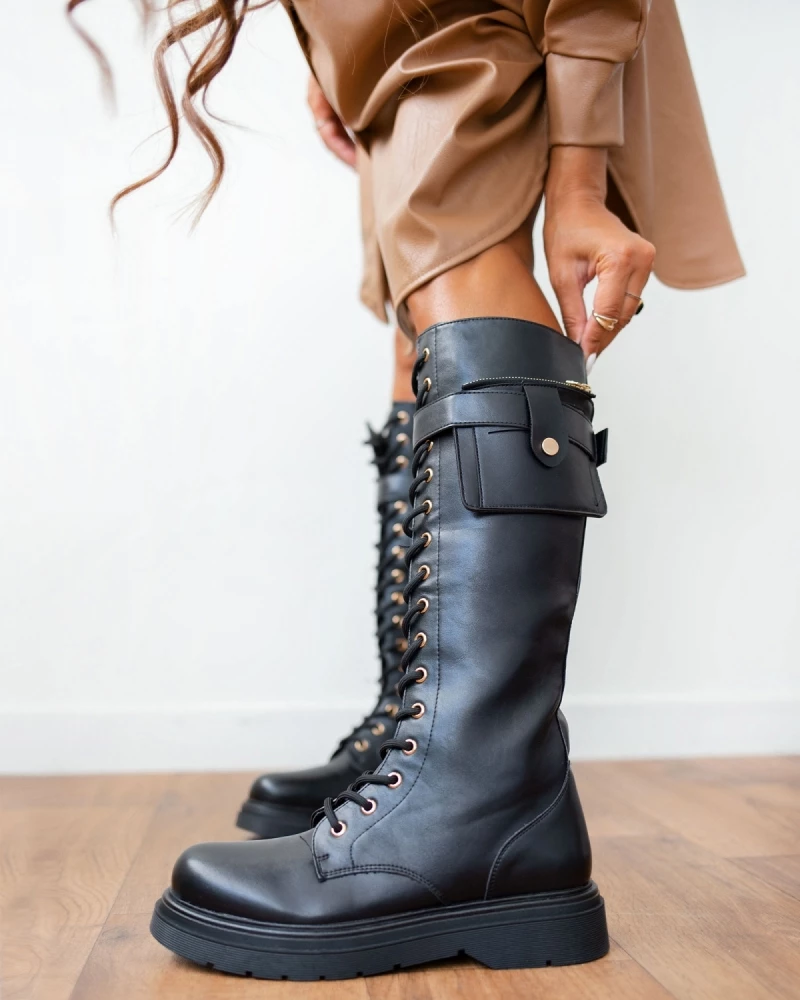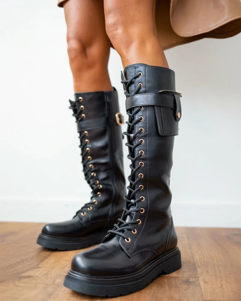 Μπότες ψηλές με κορδόνια.Έχουν αποσπώμενο ζωνάκι με πορτοφολάκι στο τελείωμα.