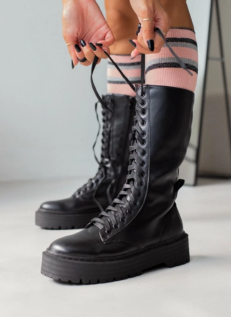 Μπότες με κορδόνια. Φτάνουν στη μέση της γάμπας. Διπλή σόλα.