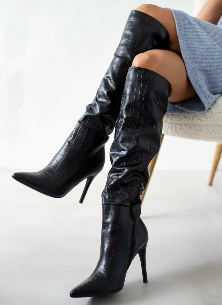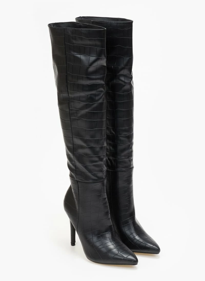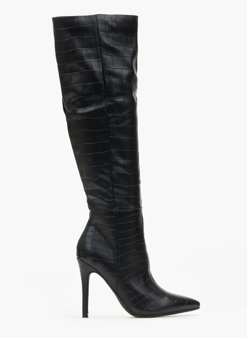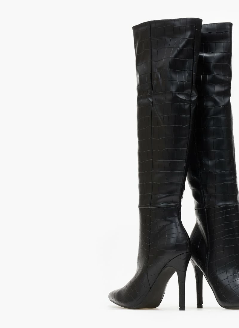 Μπότες πάνω από το γόνατο με pattern κροκό. Μυτερή φόρμα. Ψηλό λεπτό τακούνι.