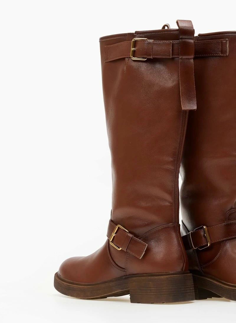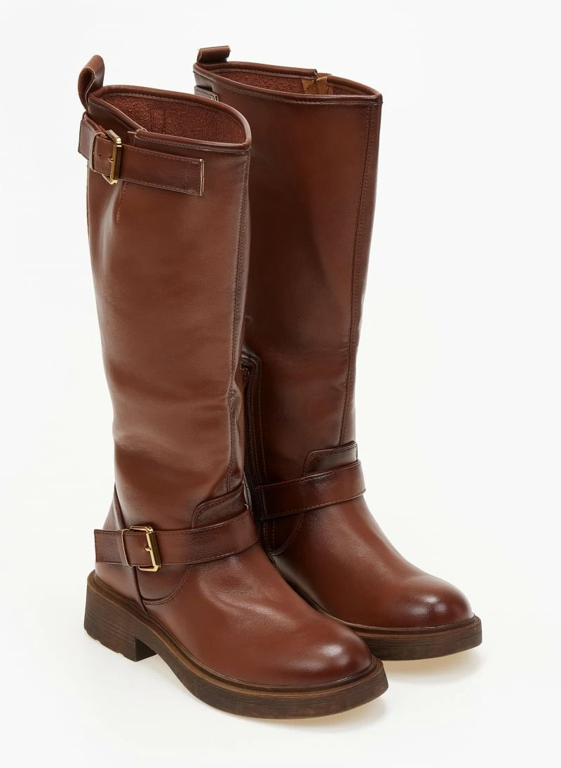 Casual μπότες σε στρογγυλή γραμμή. Διαθέτουν δύο ζωνάκια ,στο κουντεπιέ και στο τελείωμα. Έχουν φερμουάρ εσωτερικά στο μισό ύψος της μπότας.