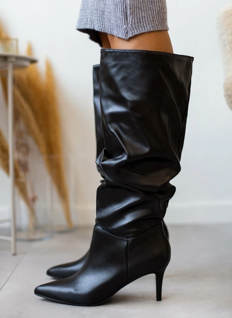 Μυτερές μπότες με λεπτό τακούνι.Έχουν σχέδιο σούρες στη γάμπα.