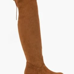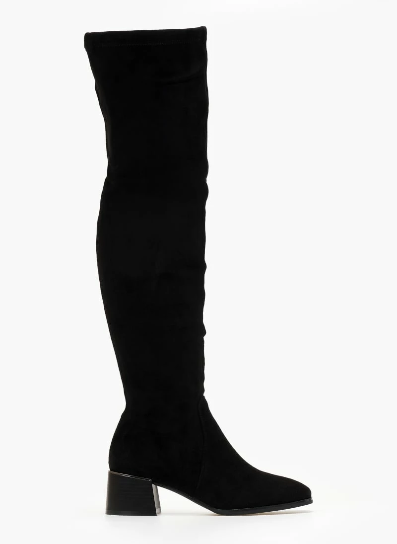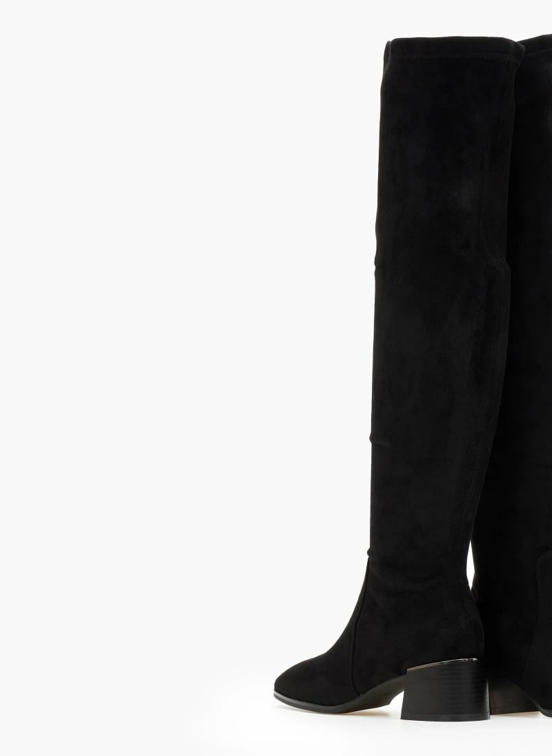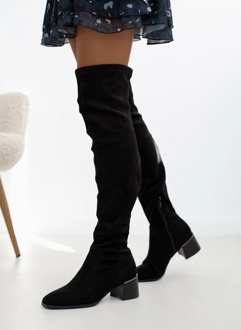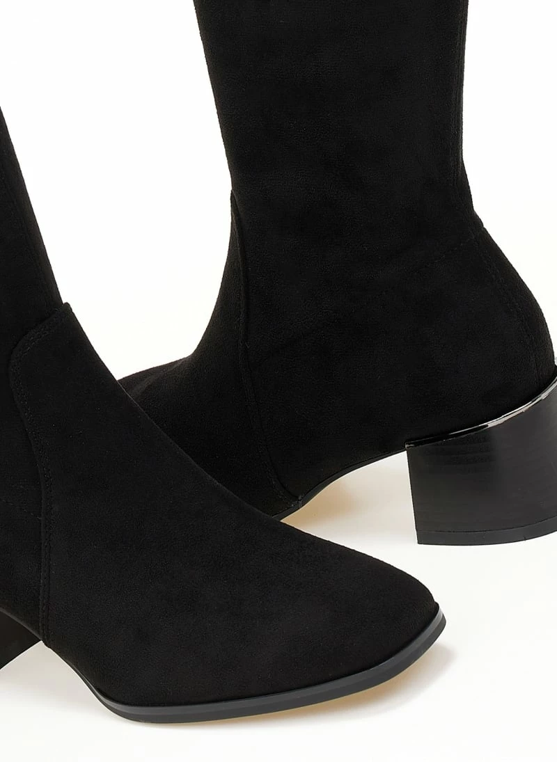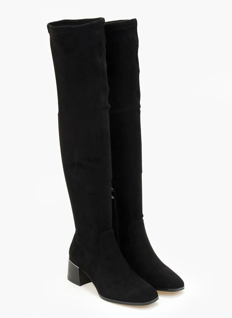 Μπότες suede πάνω από το γόνατο με χαμηλό τετράγωνο τακούνι. Kαρέ γραμμή. Έχουν μεταλλική λεπτομέρεια στο πίσω μέρος.