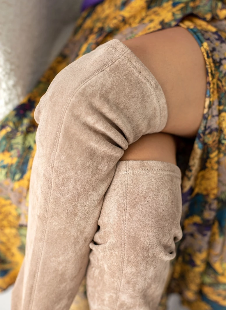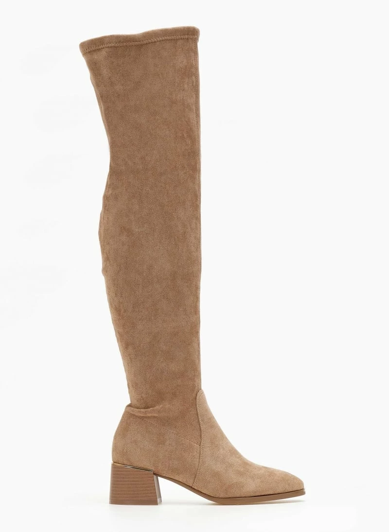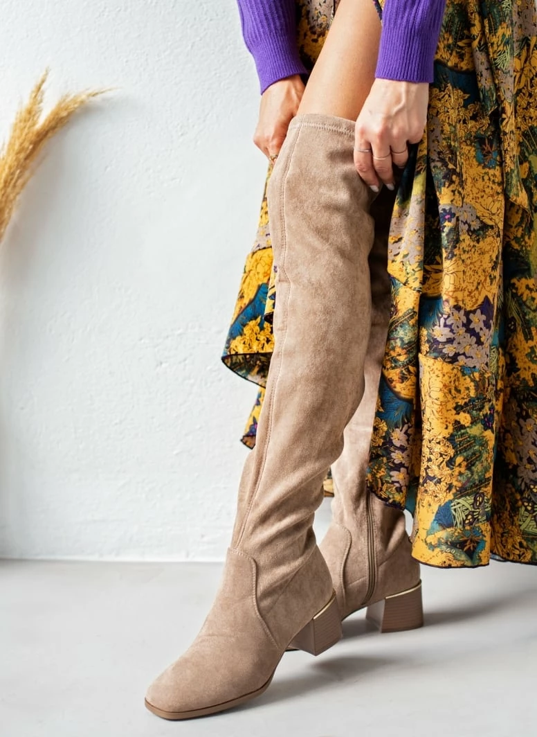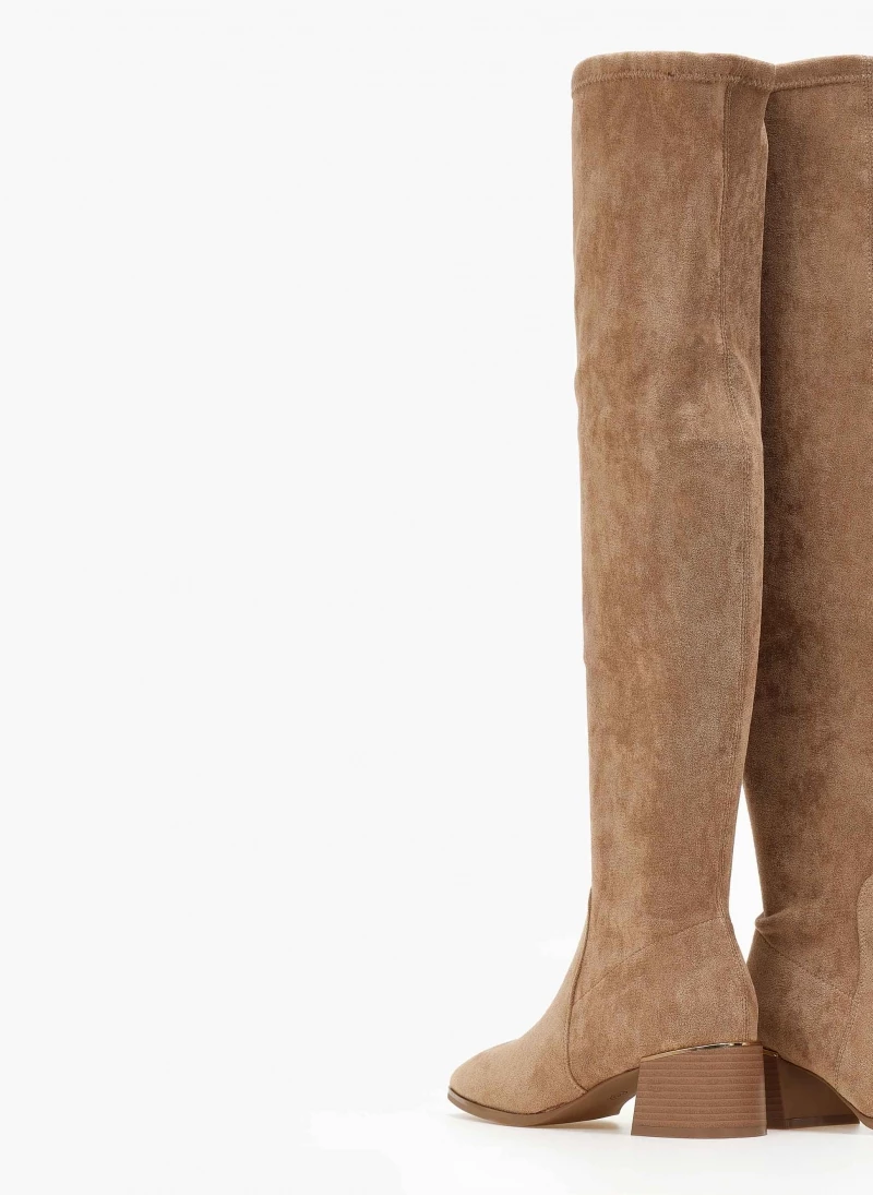 Μπότες suede πάνω από το γόνατο με χαμηλό τετράγωνο τακούνι. Kαρέ γραμμή. Έχουν μεταλλική λεπτομέρεια στο πίσω μέρος.