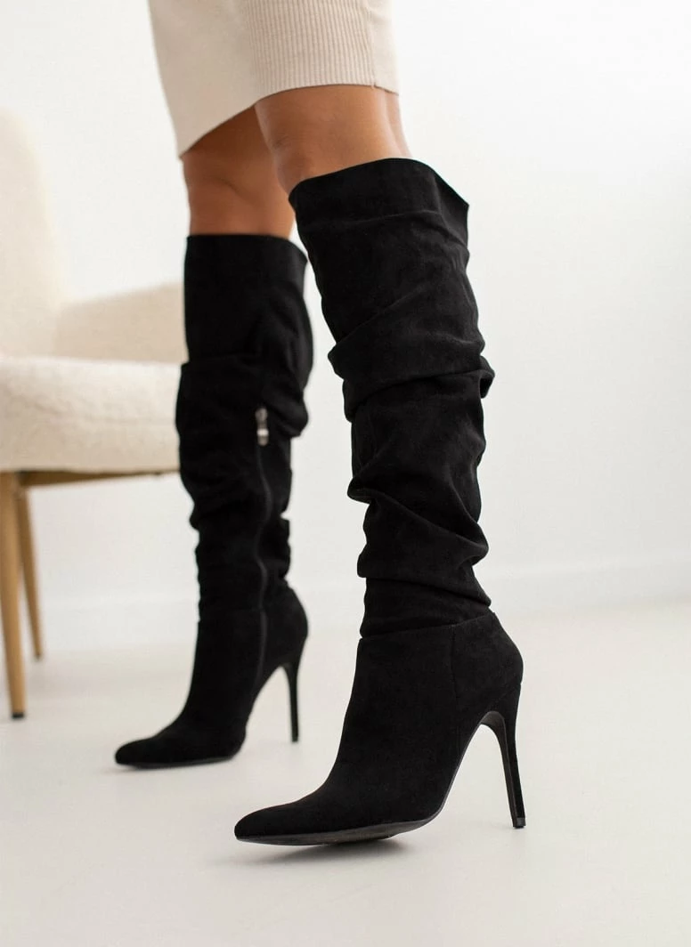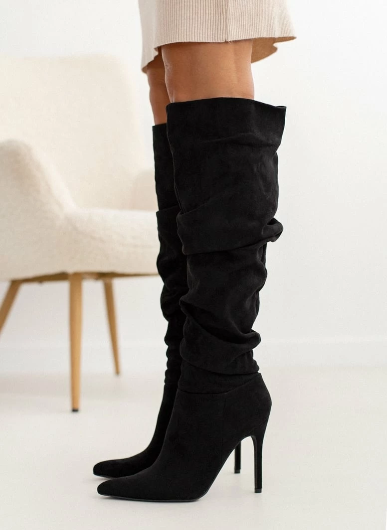 Μπότες μυτερές πάνω από το γόνατο. Έχουν λεπτό ψηλό τακούνι. Σχέδιο σούρες στη γάμπα.