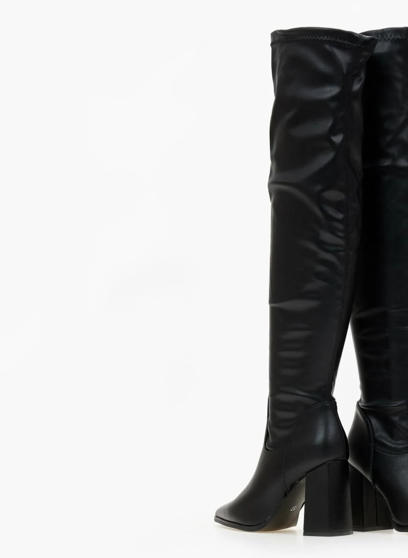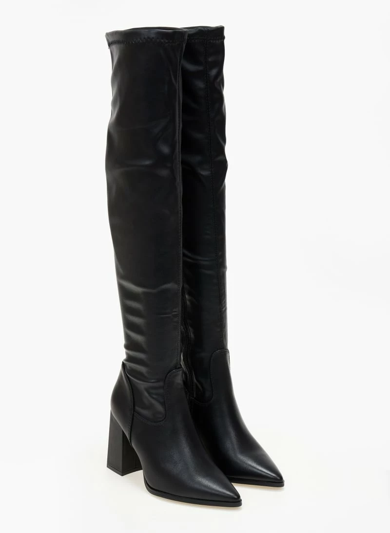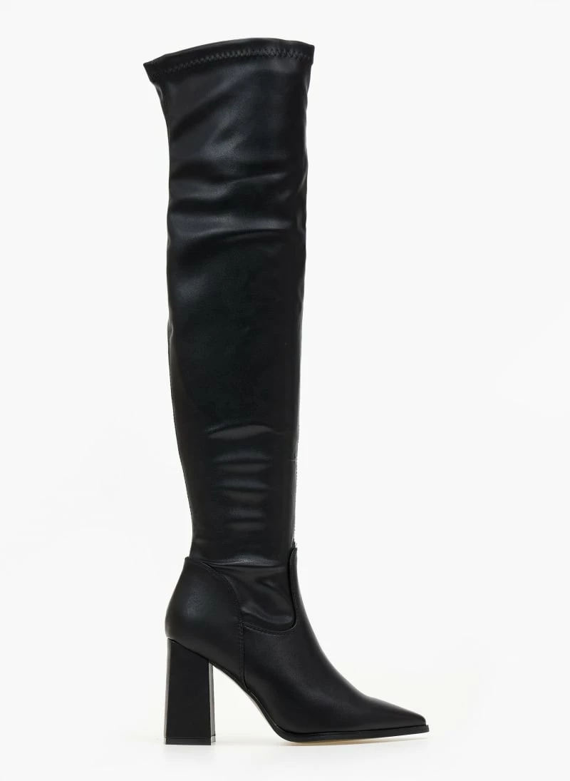 Μυτερές μπότες πάνω από το γόνατο από ελαστικό τεχνόδερμα. Έχουν σχέδιο κάθετη ραφή στο πίσω μέρος.