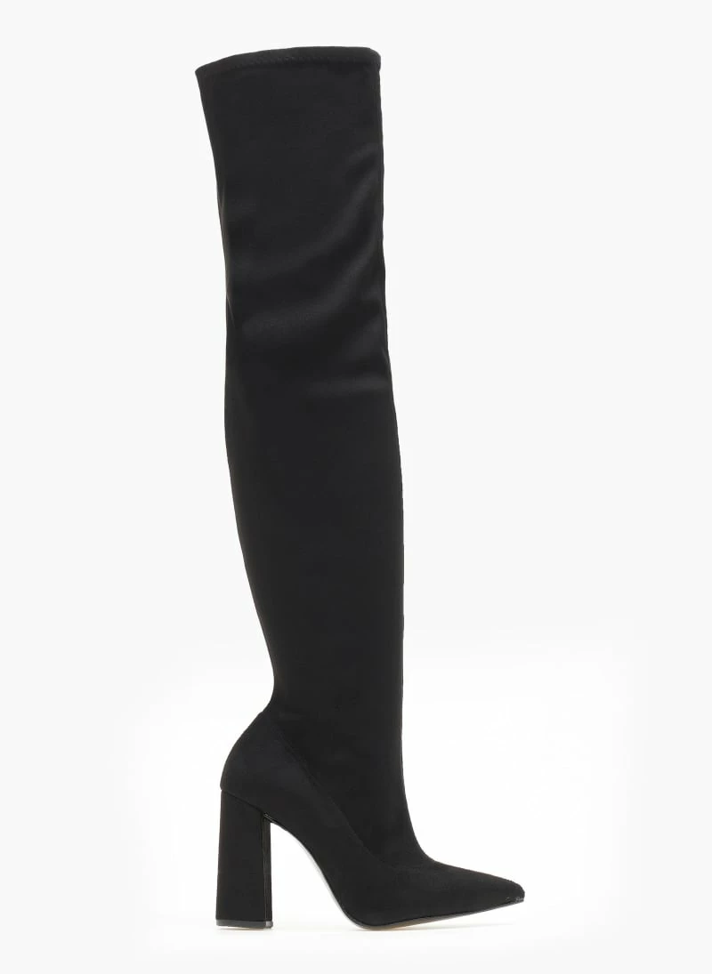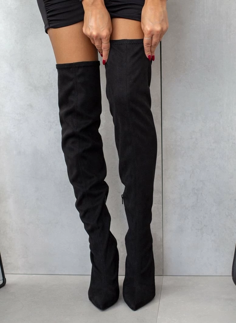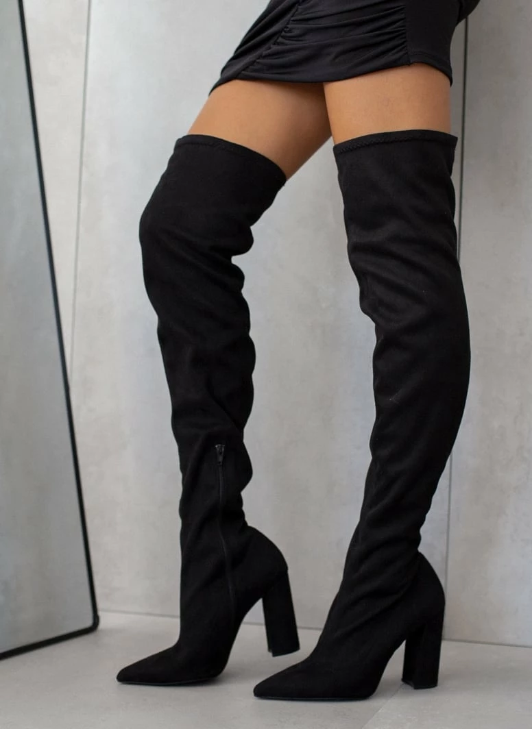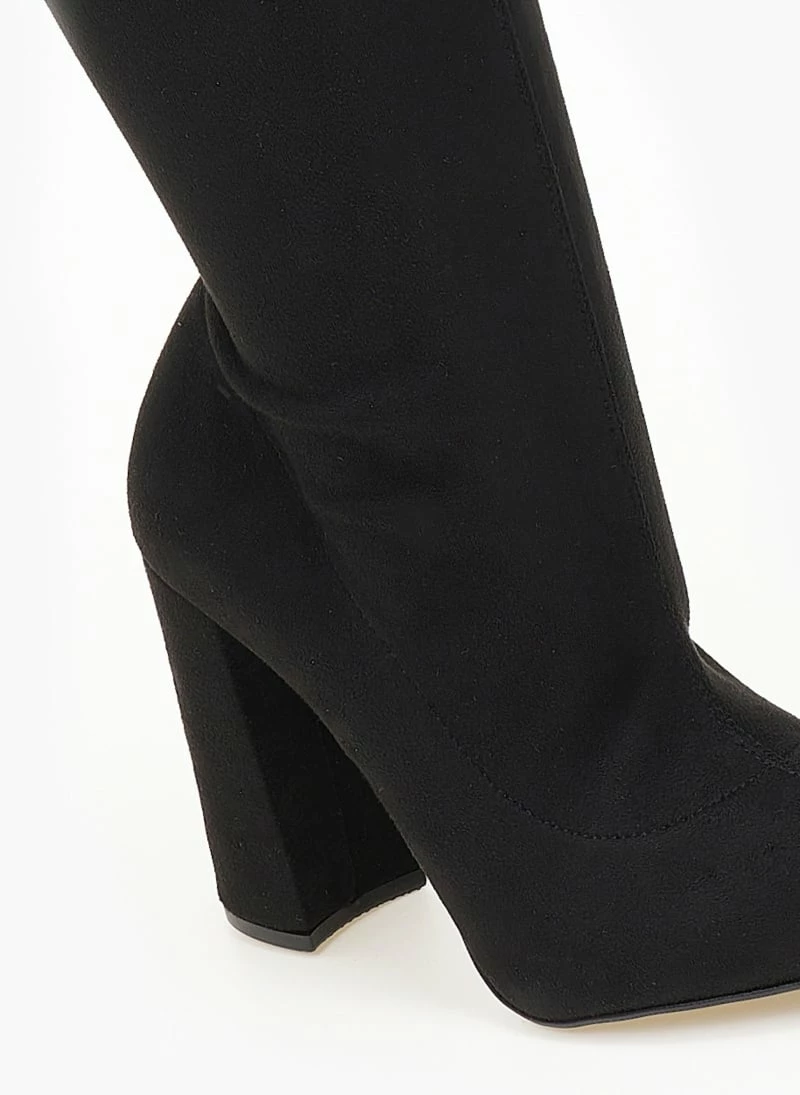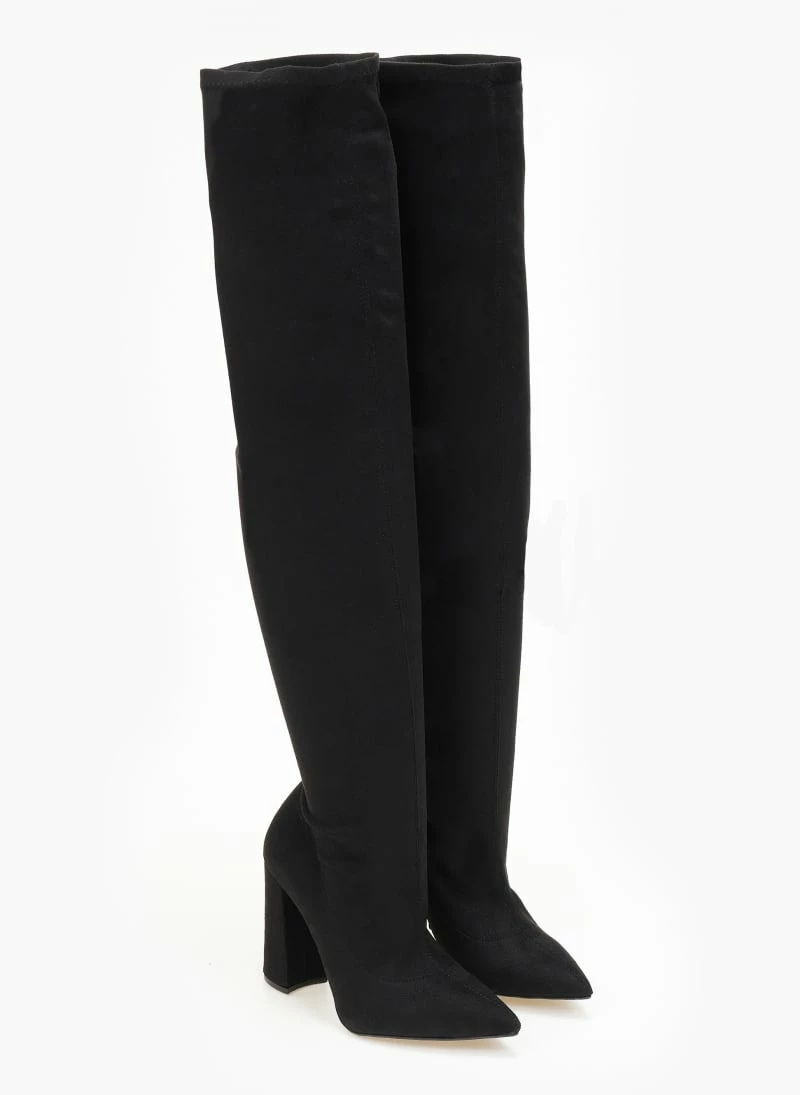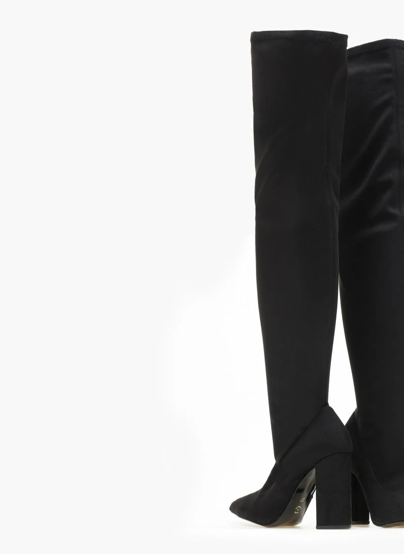 Μπότες πάνω από το γόνατο από ελαστικό suede. Μυτερή φόρμα. Ψηλό τετράγωνο τακούνι.