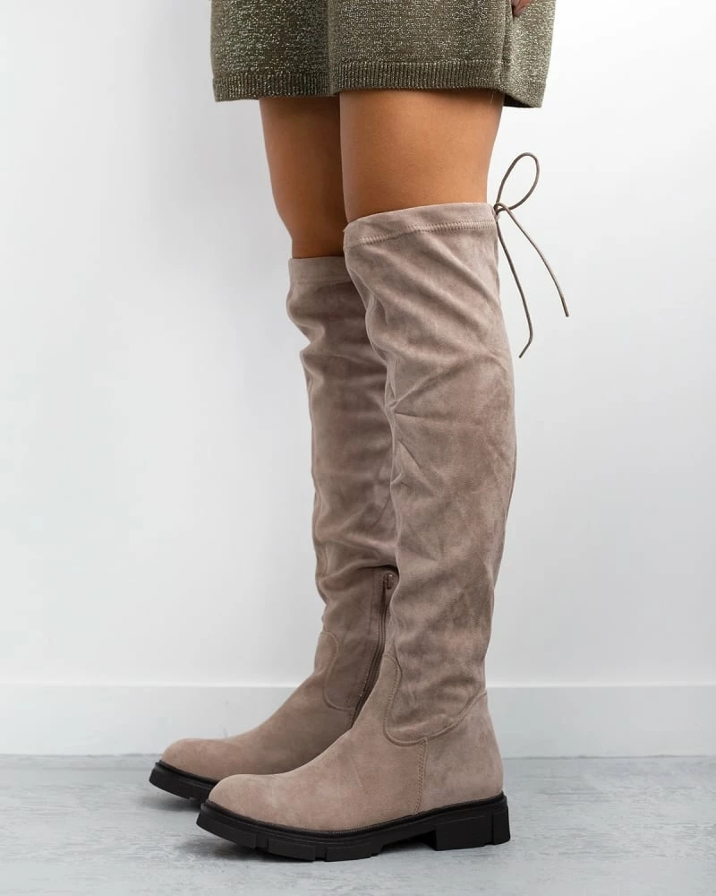 Φλατ suede μπότες πάνω από το γόνατο.Έχουν λεπτομέρεια κορδονάκι που σφίγγει στο τελείωμα.Στρογγυλή φόρμα.