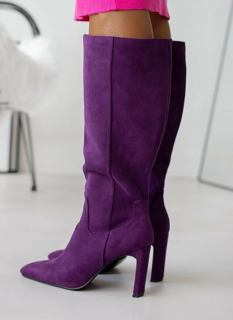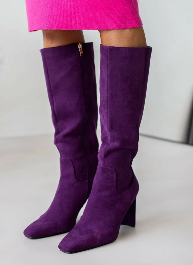 Suede μπότες με ψηλό φαρδύ τακούνι. Έχουν κάθετη ραφή στο πλάι.