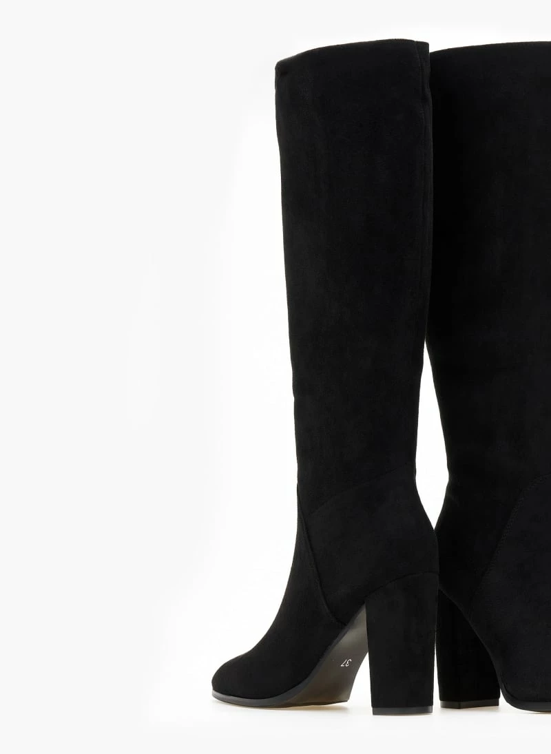 Suede μπότες με σχέδιο απο ραφές. Έχουν χνουδωτή επένδυση στο εσωτερικό τους. Το τακούνι είναι ντυμένο. Στρογγυλή γραμμή.