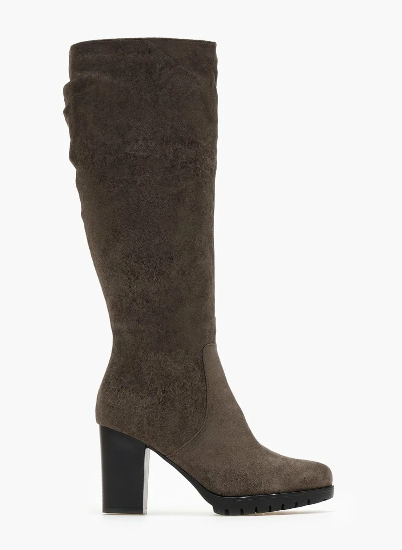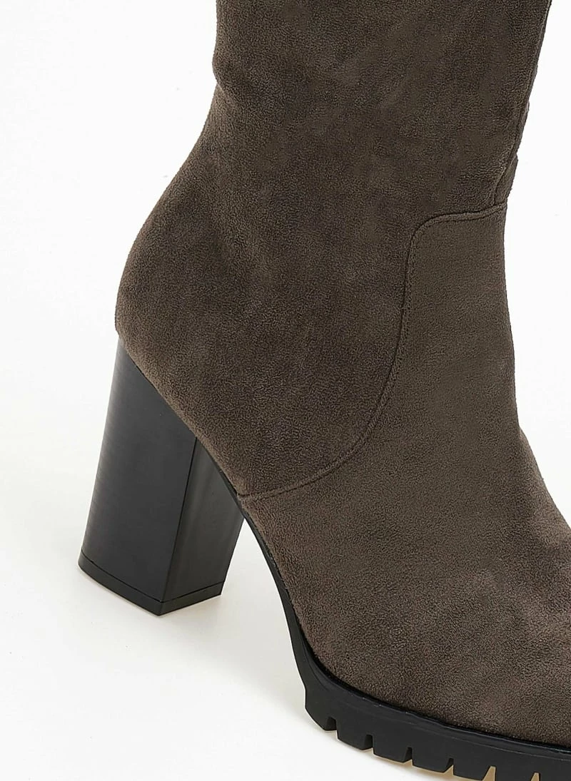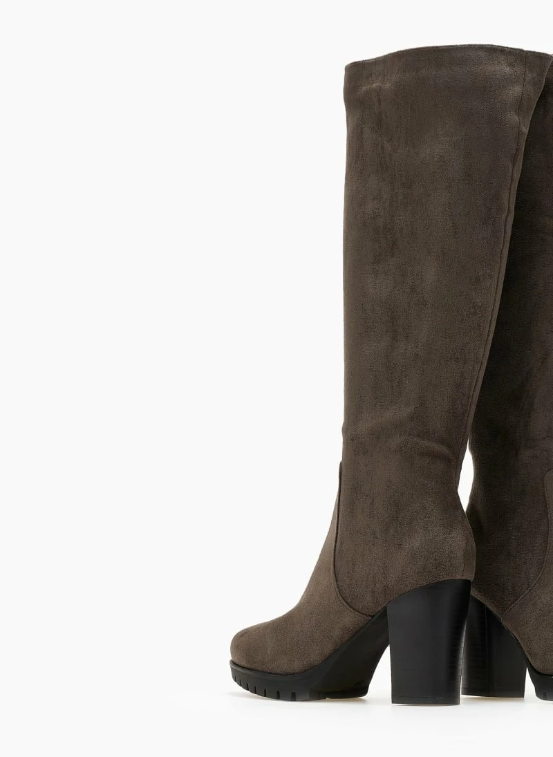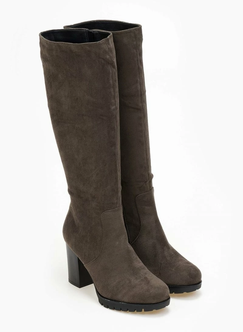 Μπότες από ελαστικό suede με τακούνι. Έχουν τρακτερωτή σόλα. Στρογγυλή γραμμή.