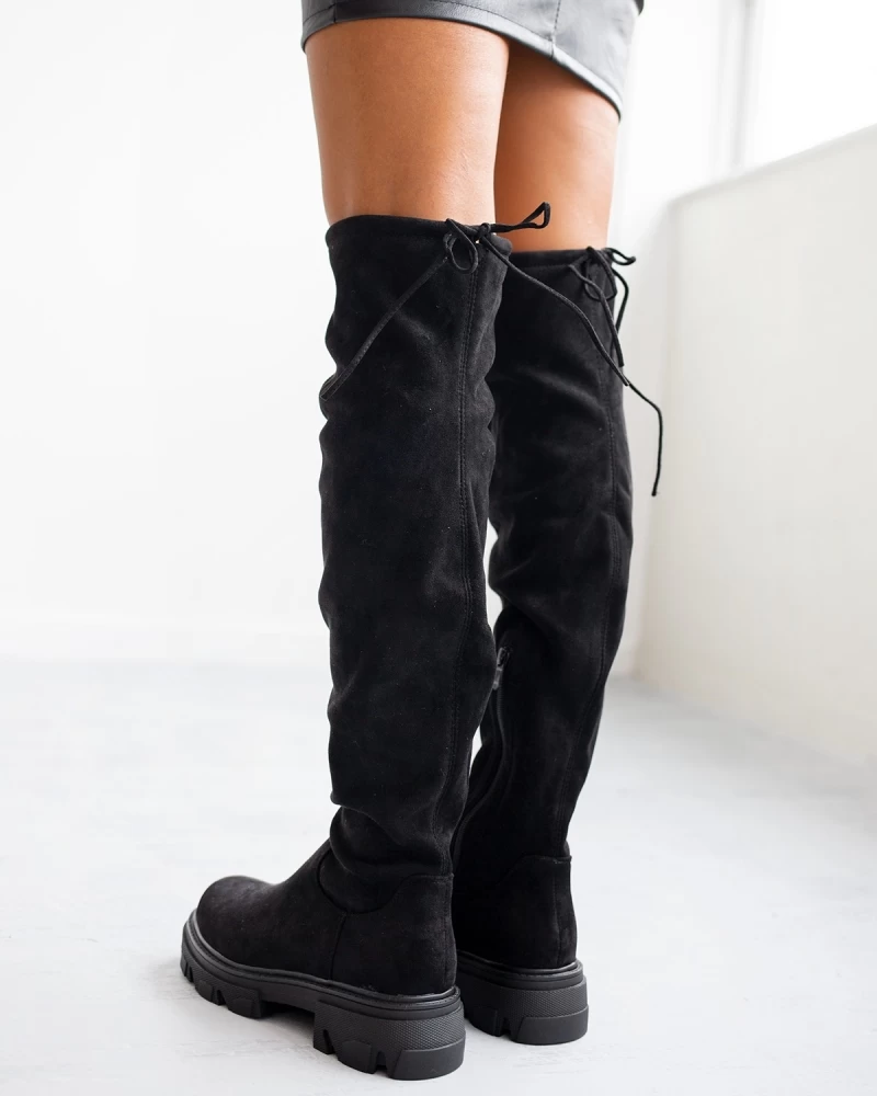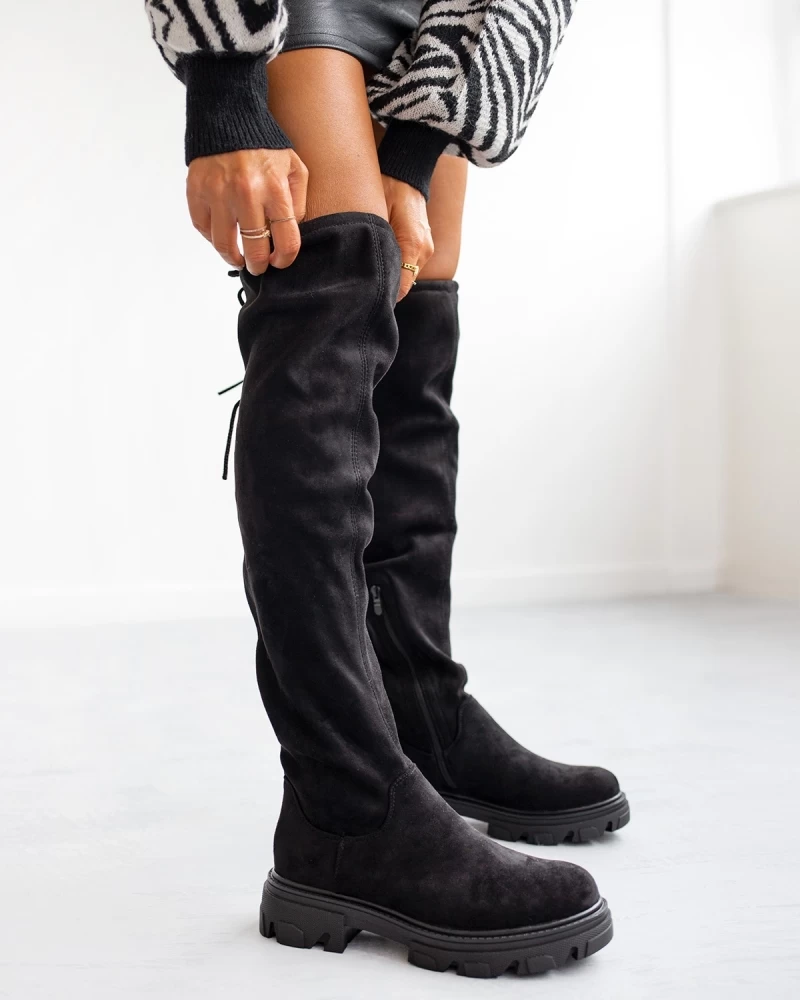 Suede μπότες πάνω από το γόνατο. Έχουν στρογγυλή γραμμή και σχέδιο στη σόλα.