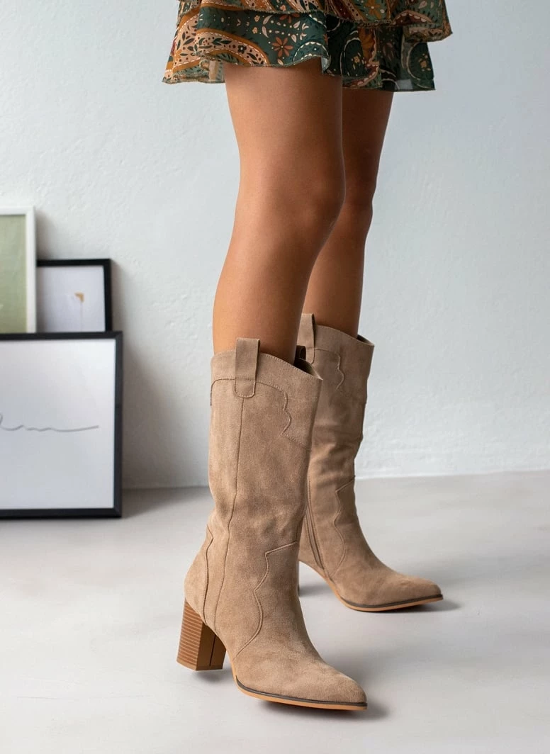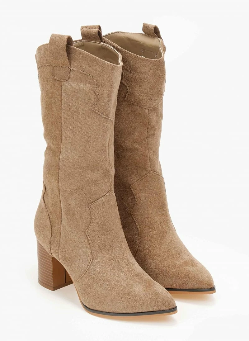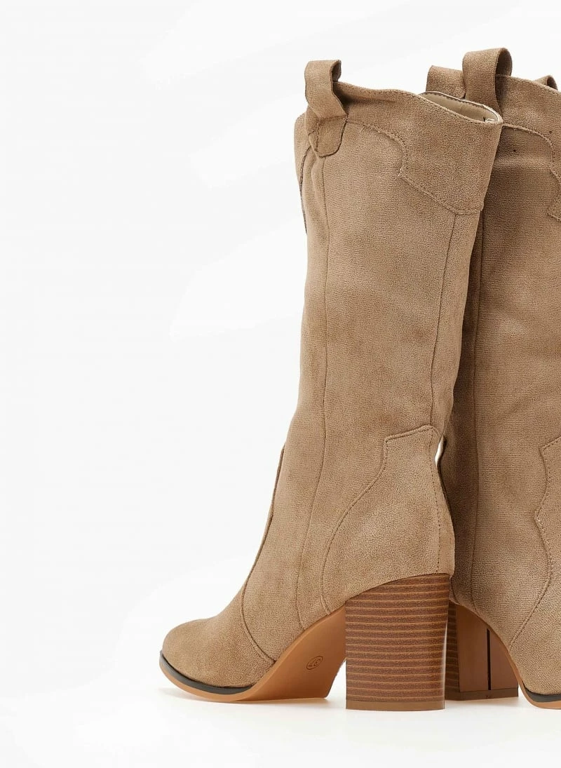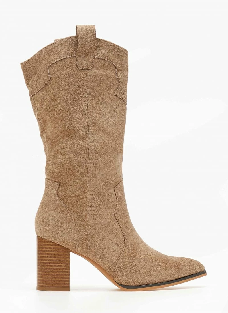 Μπότες western με ψηλό ξύλινο τακούνι. Έχουν οβάλ τελείωμα με θηλάκι. Μυτερή φόρμα.