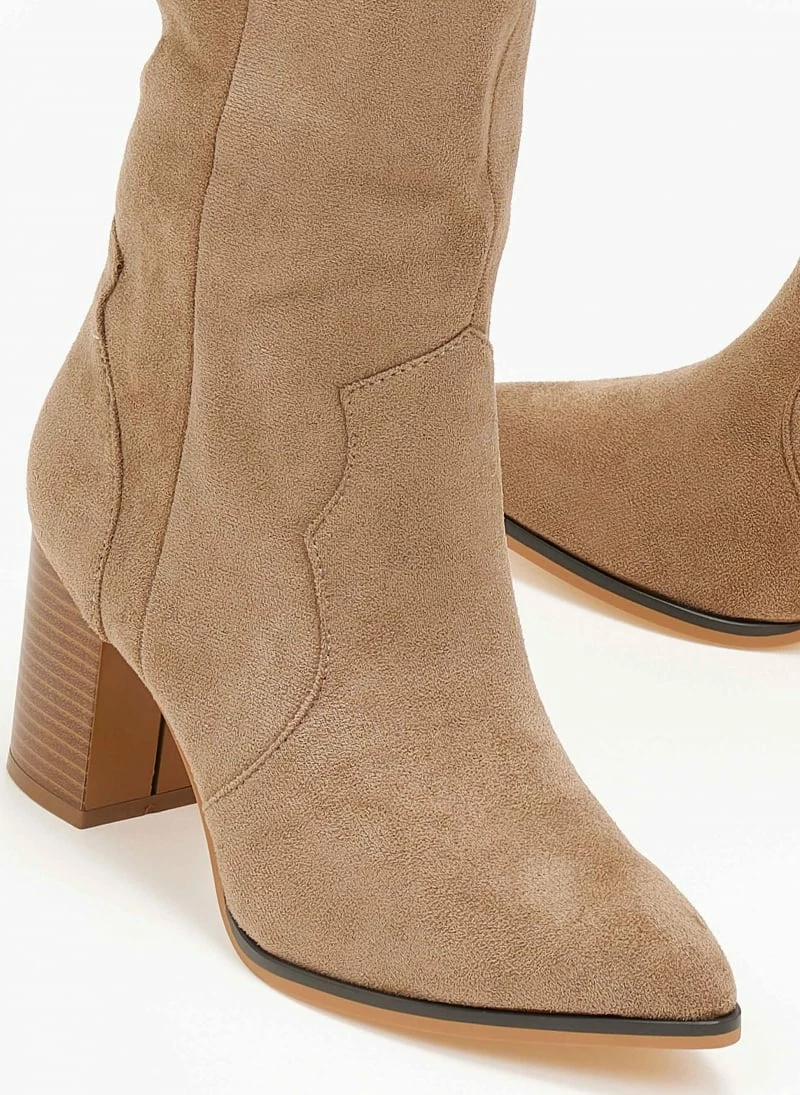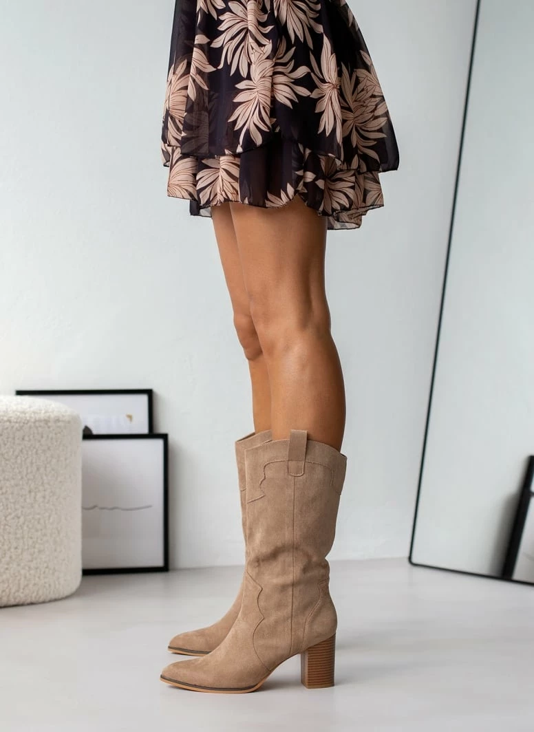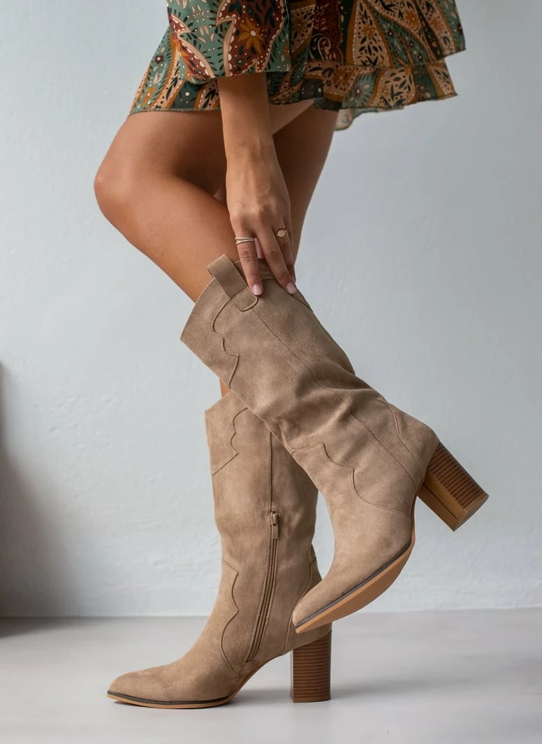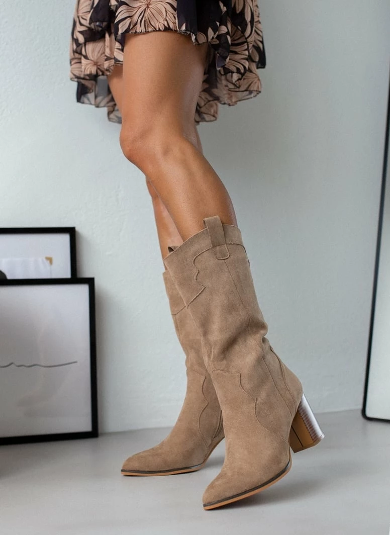 Μπότες western με ψηλό ξύλινο τακούνι. Έχουν οβάλ τελείωμα με θηλάκι. Μυτερή φόρμα.